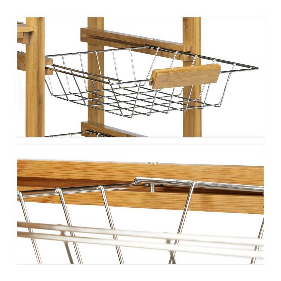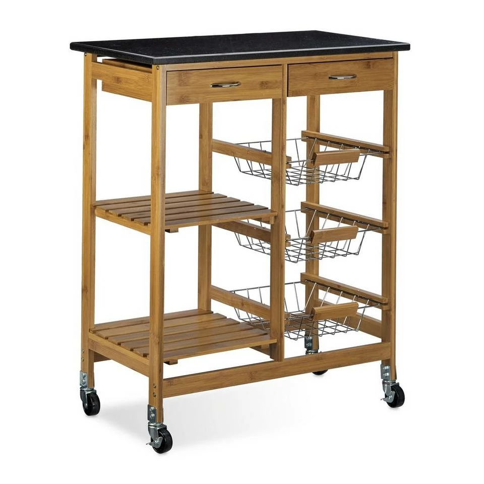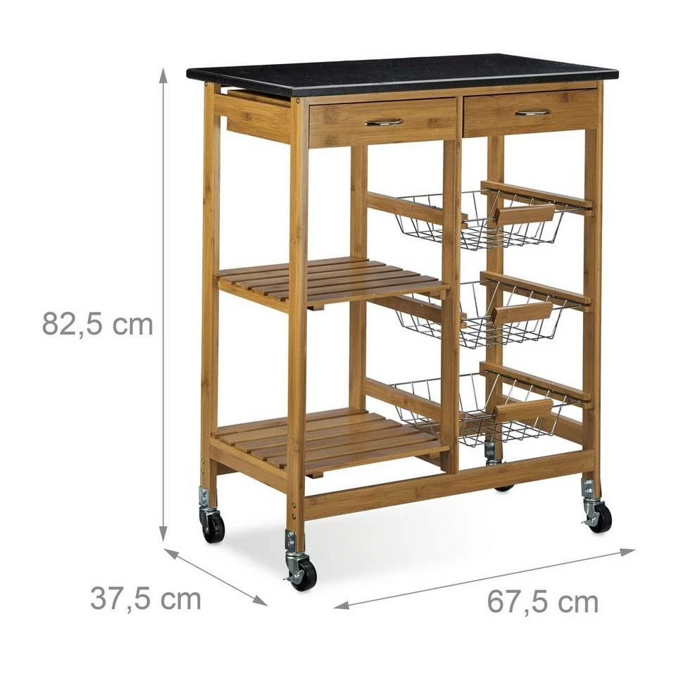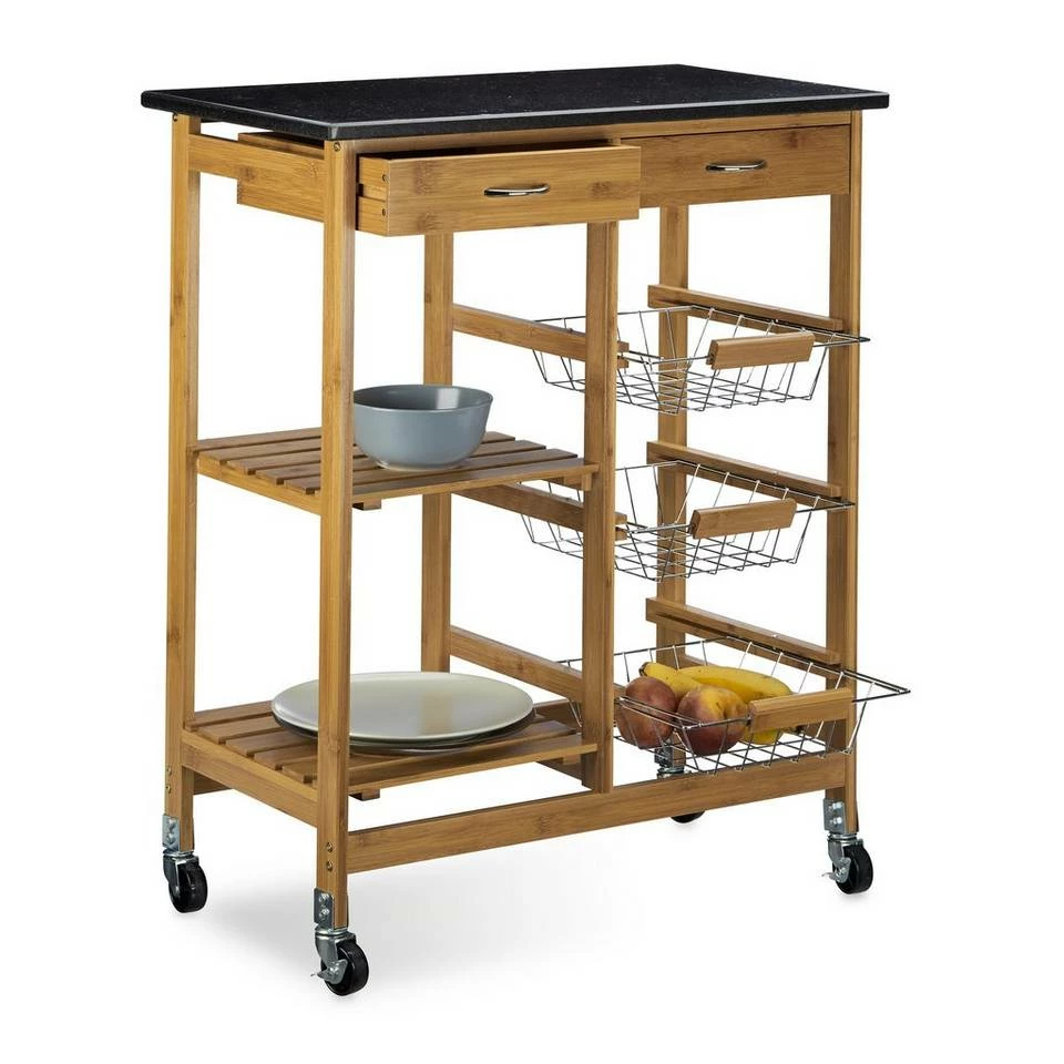 Großer Küchenwagen der ALFRED Reihe Der Küchenwagen ist der größte Vertreter der ALFRED Serie. Zum Blickfang wird er durch die eindrucksvolle Arbeitsplatte aus schwarzem Marmor. Das Gestein wirkt im Zusammenspiel mit dem natürlichen Bambus sehr edel und stilvoll. Verstauen Sie in den vielen Ablagemöglichkeiten Speisen, Lebensmittel, Geschirr uvm. Schnell und bequem haben Sie alles für das Festessen am gewünschten Platz. Dank der komplett schwenkbaren Rollen rangieren Sie mit dem Servierwagen auch auf engem Raum mühelos.