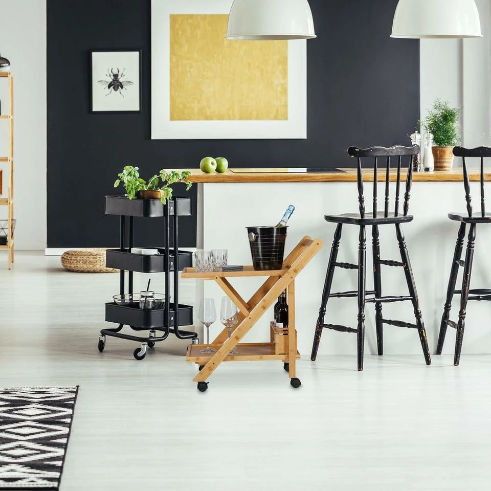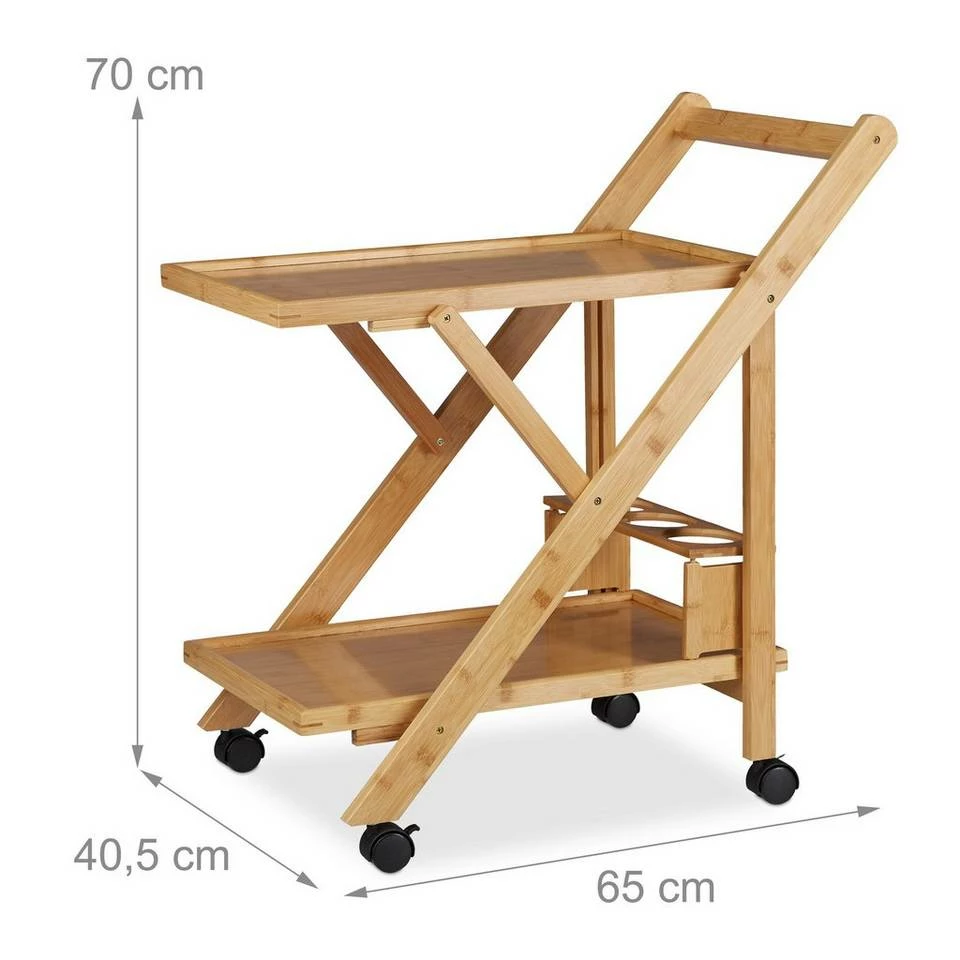 Klappbarer Rollwagen mit 2 rechteckigen Arbeitsplatten Der Rollwagen ist aus natürlich gemasertem Bambus hergestellt, der sich optisch in jede Einrichtung erstklassig einfügt. Er ist allerdings nicht nur eine Freude fürs Auge, sondern lässt sich auf sehr vielfältige Weise nutzen. Der Allzweckwagen punktet in Ihrem Haushalt, sei es als fahrbarer Beistelltisch im Wohnzimmer, als geschmeidig und fast lautlos über den Boden gleitender Servierwagen im Esszimmer oder als Teewagen auf dem Balkon. Doch selbst der größte Allrounder hat irgendwann seinen Dienst erledigt. Dann können Sie den Küchenwagen mit wenigen Handgriffen zusammenklappen und platzsparend verstauen.