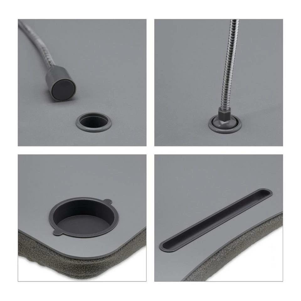 Laptopkissen mit Licht und Getränkehalter Nehmen Sie Ihr Notebook einfach auf den Schoß. Das ist sehr komfortabel für Sie und gibt Ihrem Notebook gleichzeitig festen Halt – egal ob als Notebooktisch, oder mobiler Arbeitsplatz – überall bequem arbeiten! Der Lapdeask mit feinen Mikroperlen überzeugt durch eine anatomische Form der Arbeitsfläche und sorgt mit seiner cleveren Bauweise dafür, dass dass der Laptop immer genug Luft bekommt. Das praktische Laptopkissen verfügt dazu über eine energiesparende LED-Leuchte und ein zusätzliches Fach für Becher, Tasse, Stifte oder andere Büroartikel.