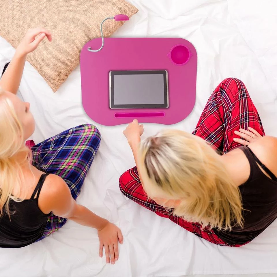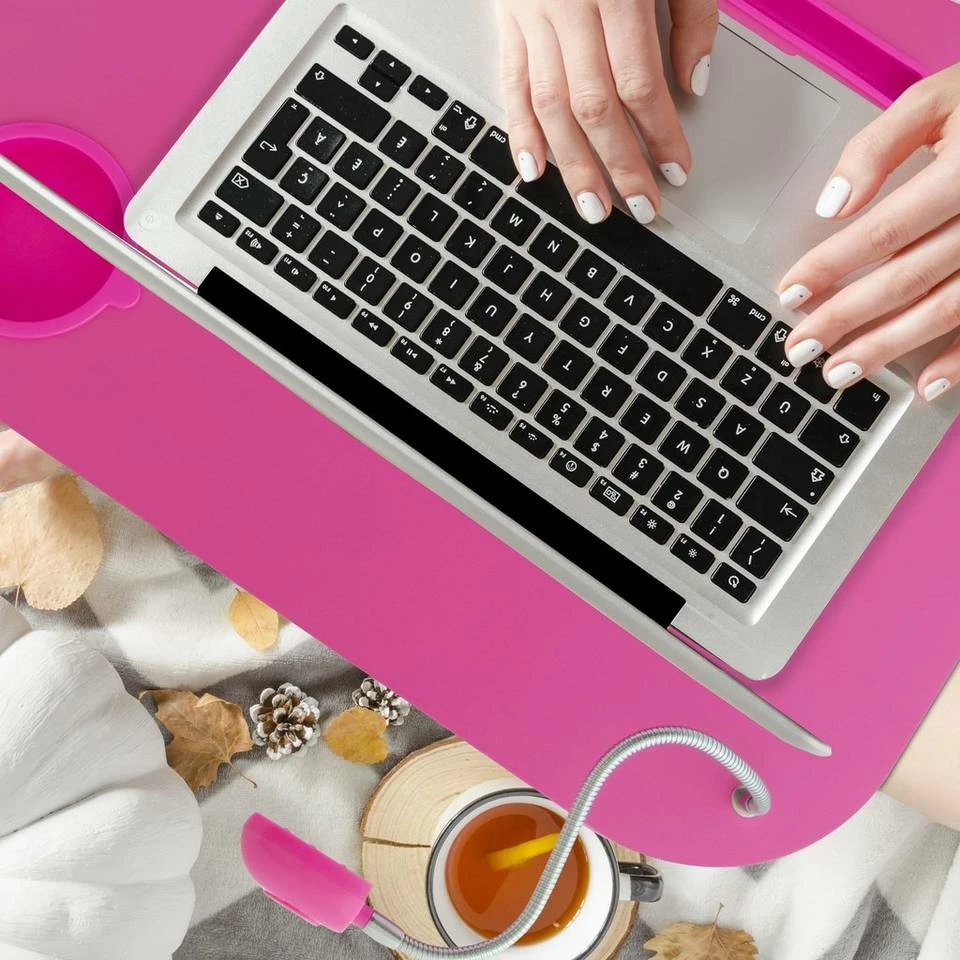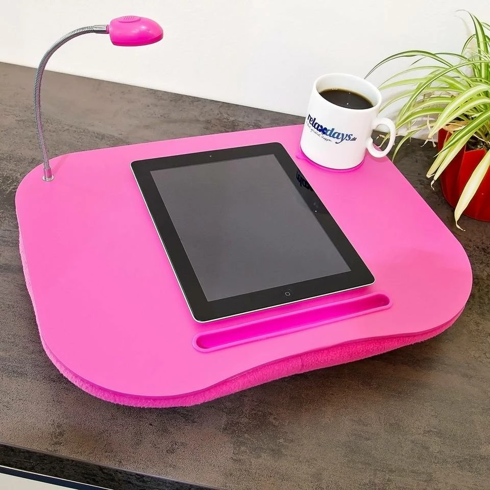Laptoptisch mit LED-Licht in Pink Arbeiten Sie zur Abwechslung mal vom Sofa aus. Hört sich gut an, doch bisher war das eher unbequem, weil der Laptop immer vom Schoß rutschte? Der Lapdesk ist vielseitig einsetzbar und erleichtert das Arbeiten oder Surfen im Internet vom Sofa aus. Ihr Notebook steht fest auf der stabilen Arbeitsfläche und Sie haben, dank der LED-Lampe, genügend Licht zur Verfügung. Die ergonomische Form, Polsterung und der Getränkehalter sind weitere Vorzüge des Laptoptisches, der mit Mikroperlen gefüllt ist.