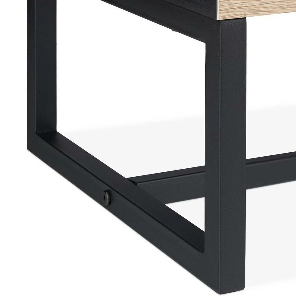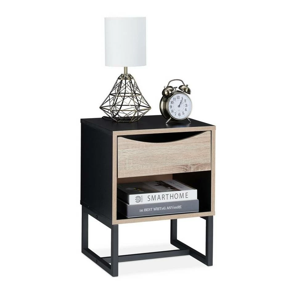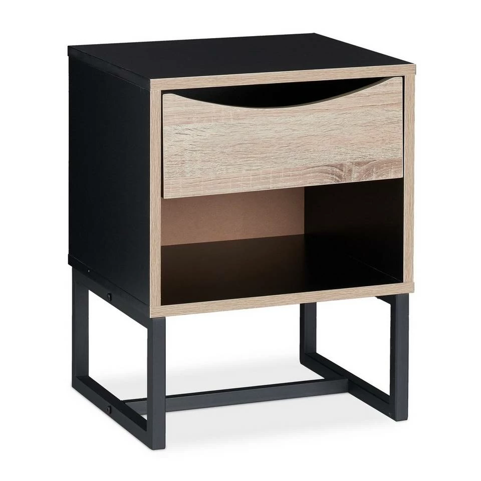 - Details: Nachtkästchen mit schwarzem Metallgestell und Korpus in Holzoptik – HBT ca. 50 x 39 x 35 cm