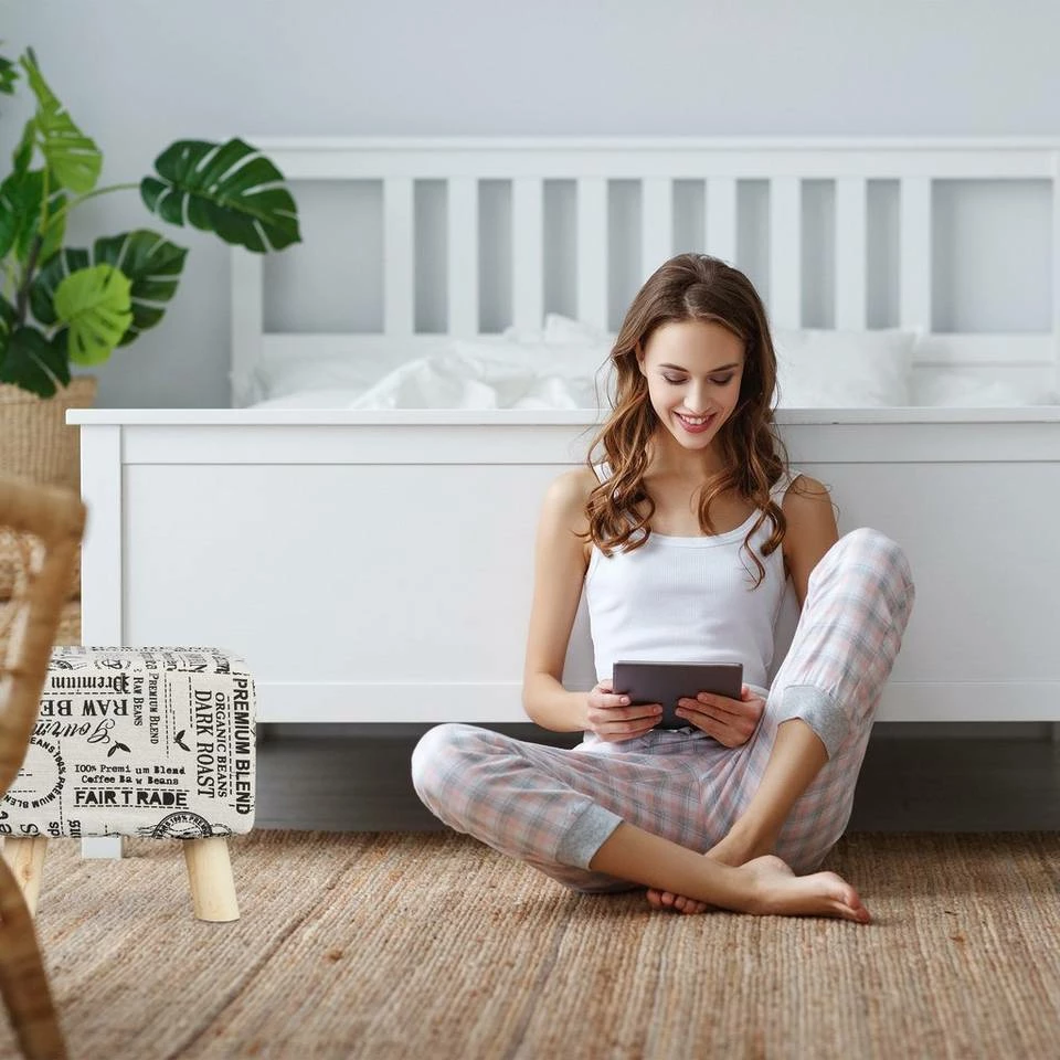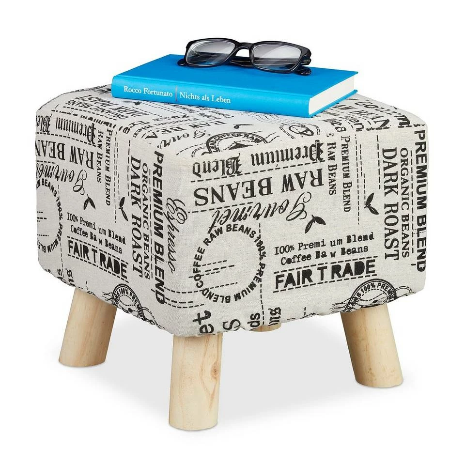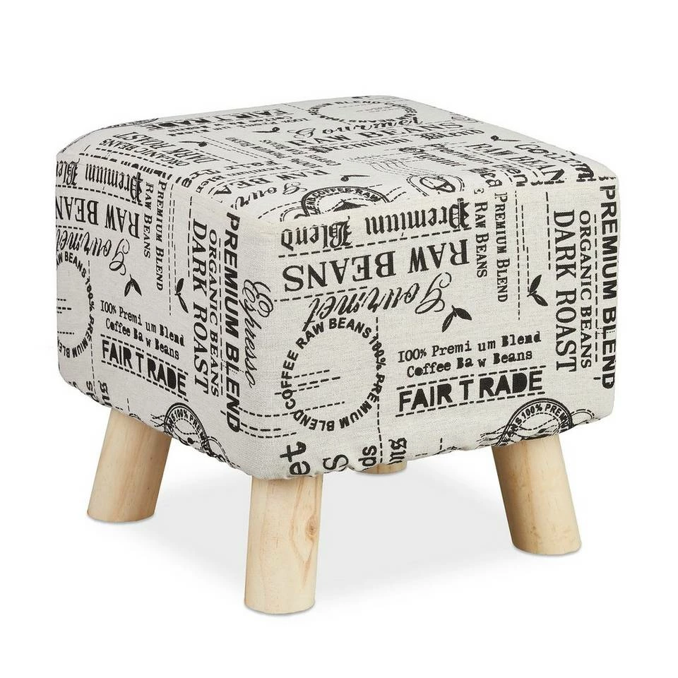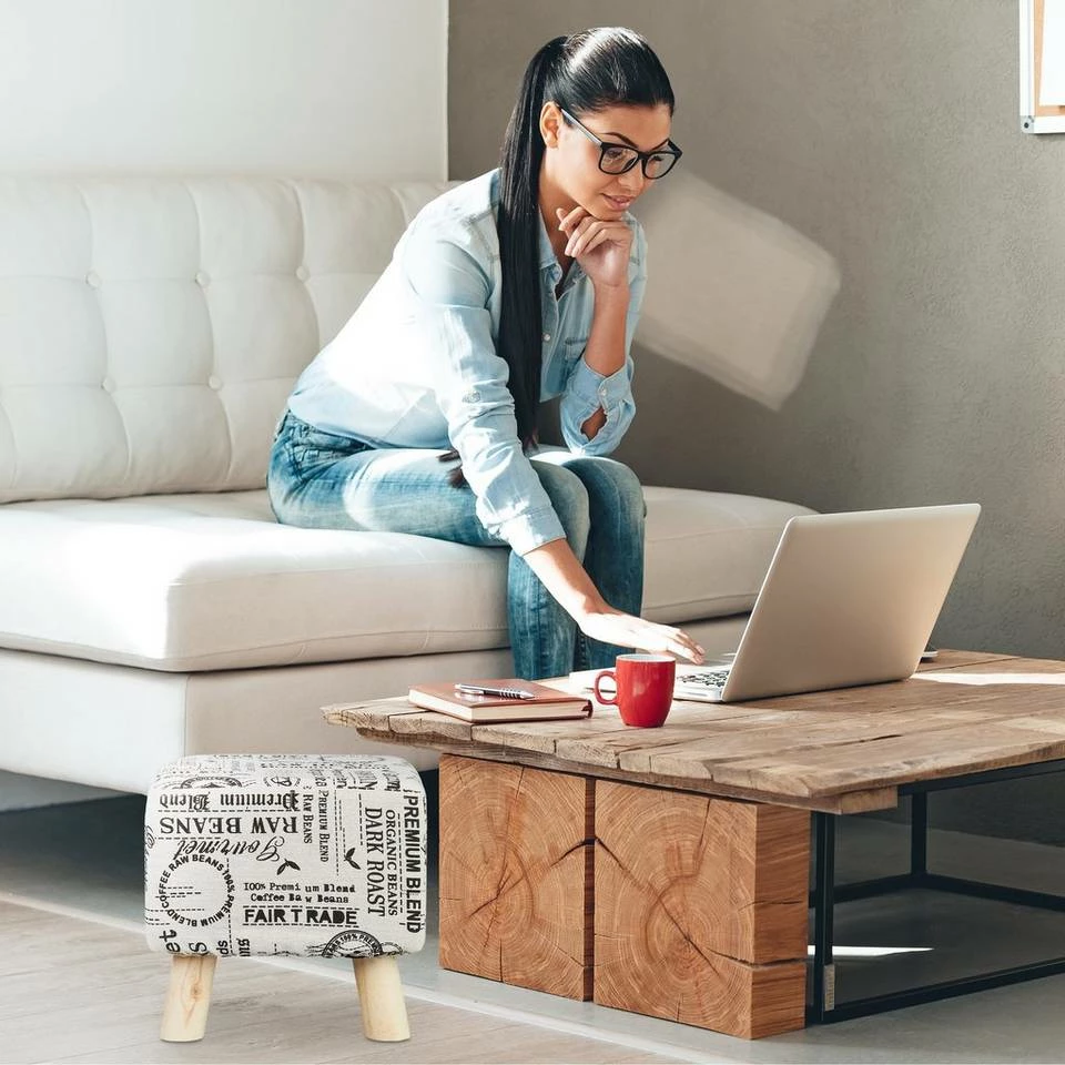 Stoffhocker mit Kaffeesack-Muster Gerade in kleineren Wohnräumen braucht es Gegenstände, die viele Funktionen erfüllen können. So zum Beispiel dieser gepolsterte Hocker: Er eignet sich ideal zum Hochlegen der Füße nach einem langen Tag, zum Sitzen wenn viel Besuch kommt und als kleine Ablagefläche. In welcher Art Sie auch diesen Sitzhocker verwenden – das natürliche Design passt immer. Das Kaffeesack-Muster auf dem Stoffüberzug und die Holzbeine verleihen einen natürlichen und bodenständigen Look.