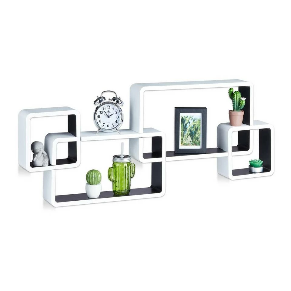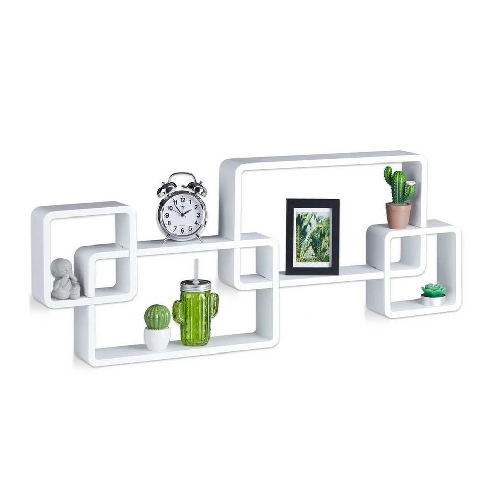 Dekoratives Schweberegal mit Cubes Wenn Sie leere Wände mit einem echten Eyecatcher verschönern wollen, ist dieses Cube Regal ein heißer Tipp. Von langweiligen Symmetrien will es nichts wissen, sondern zieht mit seinen Regaleinheiten in unterschiedlichen Formen und Größen neugierige Blicke nahezu magisch an. Damit werden Vasen, Schatullen und andere Dekoartikel von dem Hängeregal erstklassig in Szene gesetzt. Um das Wandregal zu montieren, brauchen Sie nicht zur Bohrmaschine greifen, denn die Teile werden einfach zusammengesteckt.
