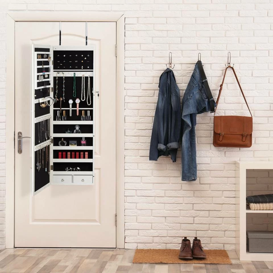 XXL Schminkschrank zur Tür- oder Wandmontage Wenn Sie Schmuck lieben, dann ist dieser Schmuckhalter die richtige Wahl. Das große Schnmuckregal bietet viel Platz für Halsketten, Ohrringe- und stecker, Ringe und Armbänder. In den Fächern und Schubladen können zusätzlich Kosmetikartikel und Parfums gelagert werden. Der Wandschmuckschrank verfügt innen über LED Beleuchtung, sodass Ihre Schmuckstücke in schönem Glanz erstrahlen. Dank Magnetmechanismus schließt der Parfümschrank sicher und kann zusätzlich auch abgeschlossen werden.