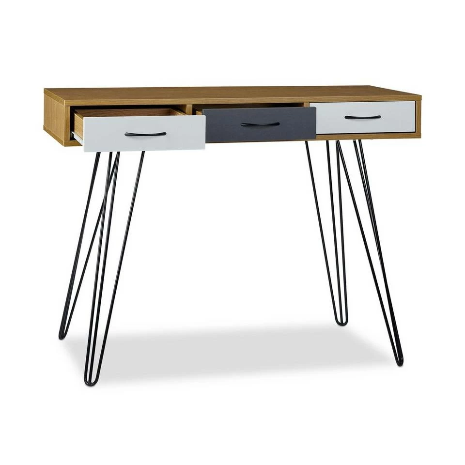 Designer Schreibtisch mit 3 Schubladen Der moderne Schreibtisch in stylischer Farbkombination punktet neben seinem schicken Erscheinungsbild auch dadurch, dass er jede Menge Stauraum für Büroartikel bietet. In den grauen und weißen Schubfächern liegen Dokumente, Schreibwaren und Sonstiges immer griffbereit und sind ordentlich aufbewahrt. Die breite Arbeitsfläche in hellbrauner Holzoptik passt optisch gut zu den stabilen Metallbeinen und ergibt so einen Bürotisch, der sich prima in die verschiedensten Einrichtungsstile einfügt.