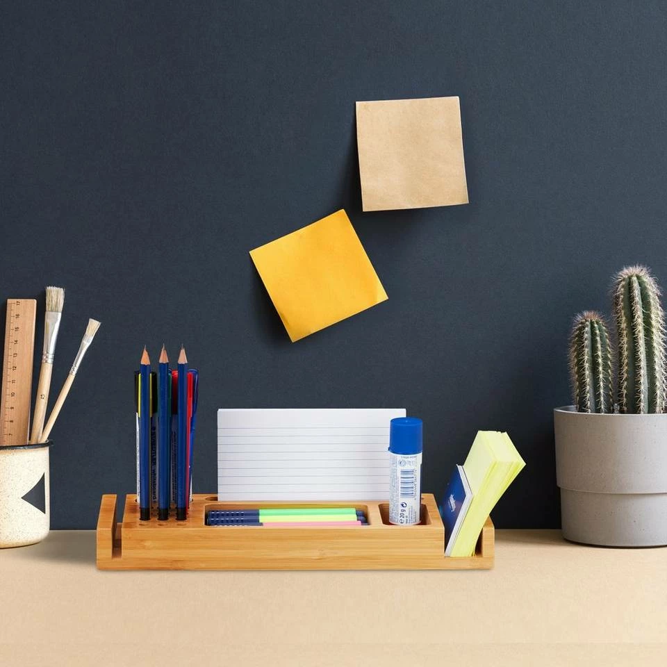Büro Organizer für Übersichtlichkeit Platz für Stifte, Zettel, Büroklammern und vieles mehr bietet dieser Schreibtisch Organizer aus natürlichem Bambus. In verschiedenen Fächern können vor allem Stifte, aber auch Klebezettelblöcke und Briefe aufbewahrt werden. Durch das flache Design behalten Sie leicht den Überblick über den Inhalt Ihres Tischorganizers und halten Ihren Schreibtisch stets aufgeräumt und übersichtlich. Dadurch können Sie sich fokussiert Ihrer Arbeit widmen. Das schlichte Design passt ins Büro und Ihr zu Hause.