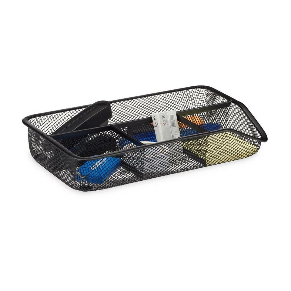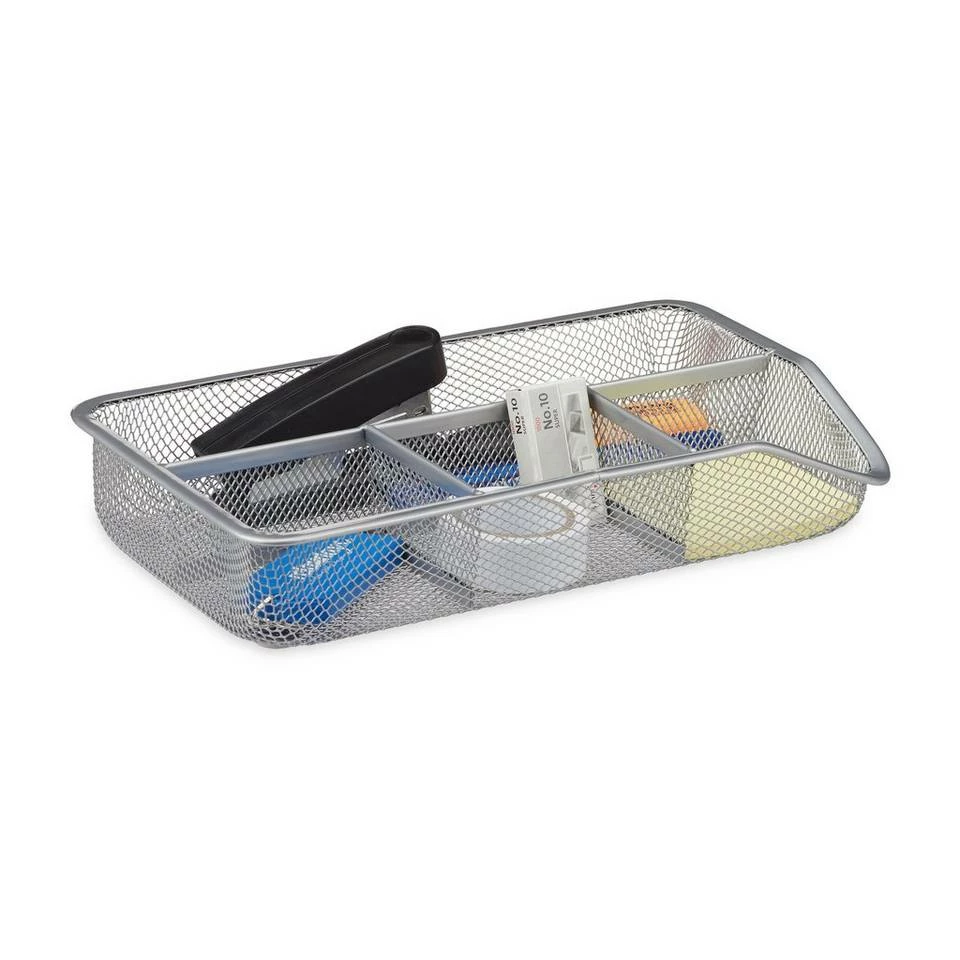 Schreibtischorganizer mit 4 Ablagen Metallgeflecht Der kompakte und flache Schreibtisch-Organizer bietet Platz für Stifte, Pinsel, Haftzettel, Büroklammern uvm. Dank der flachen Abmaße eignet sich der Schreibtisch-Organizer auch ideal als Einlagen für die Schreibtischschublade. So verschwinden Büromaterialien erstmal aus dem Blickfeld, bleiben aber gut sortiert, ohne dass sie in der Schublade verloren gehen. Ein Fach verfügt über eine abgerundete Ecke, darüber lassen sich z.B. Haftzettel ohne große Fummelei herausnehmen.
