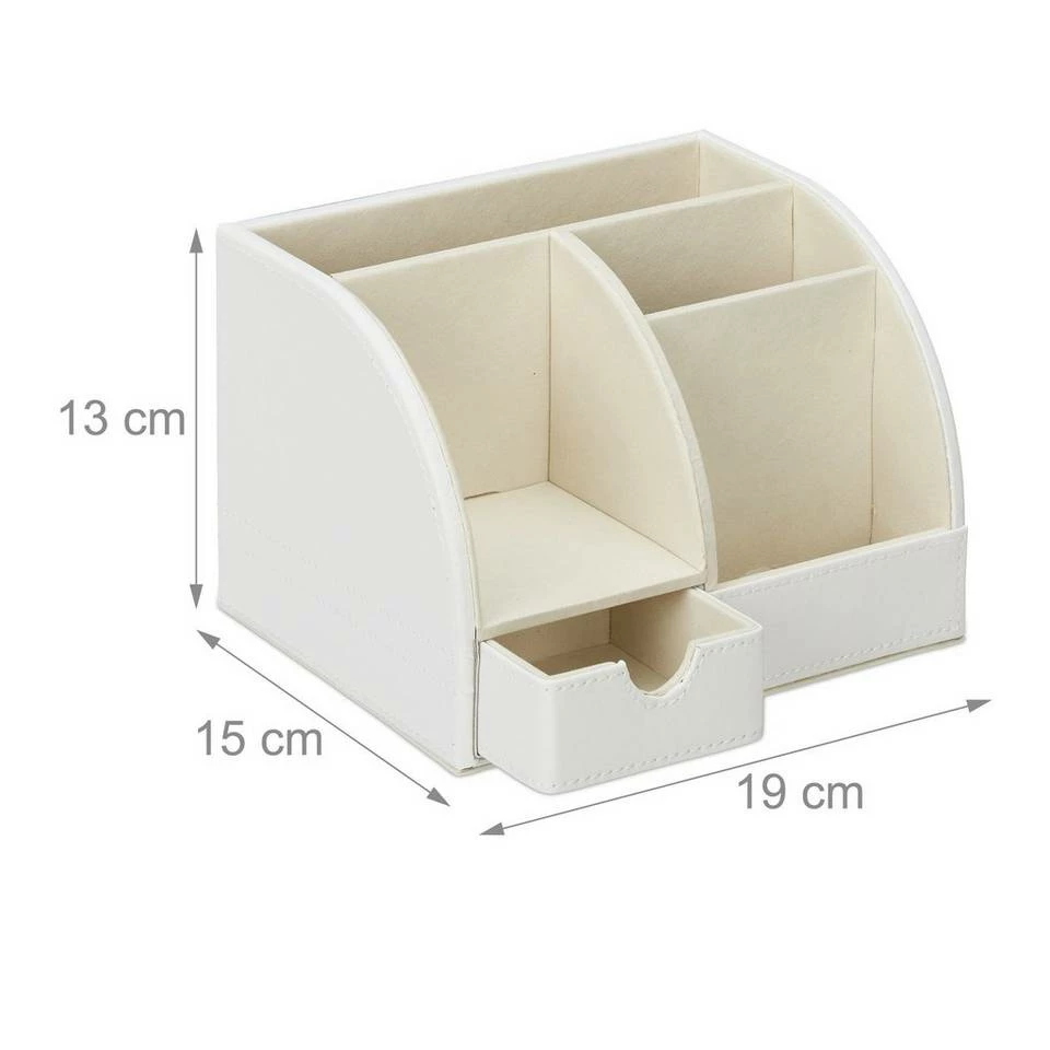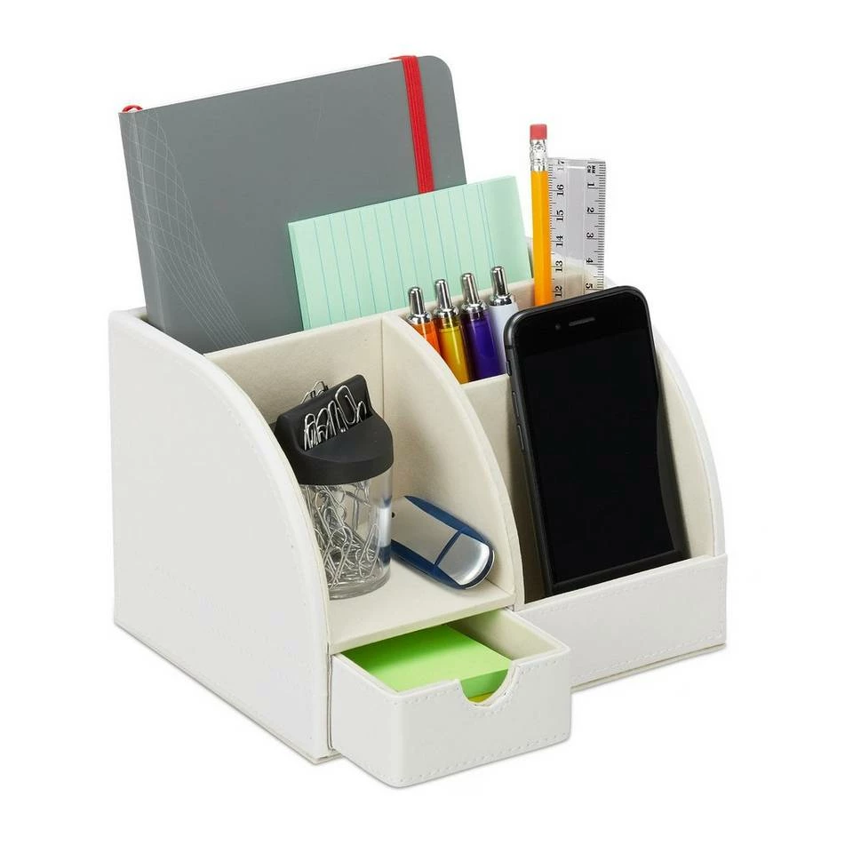 Ordnungsbox für den Arbeitsplatz Mit diesem Schreibtischorganizer wird Unordnung kein Thema mehr am Arbeitsplatz sein. In 4 Fächern und einer Schublade können Briefe, Stifte und weitere Utensilien ordentlich und griffbereit aufbewahrt werden. Der edle Look des Kunstleders verleiht Ihrem Schreibtisch zu Hause oder im Büro im Handumdrehen einen hochwertigen Touch. Dieser Büro Organizer hat außerdem eine Kabelführung, mit der Sie das Handy laden können, während es in Ihrem Blickfeld steht – Sie werden keinen Anruf mehr verpassen.