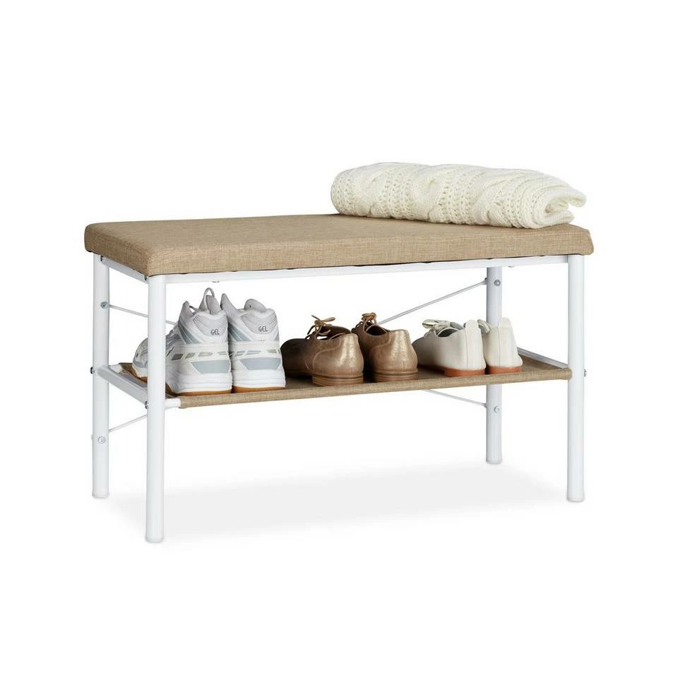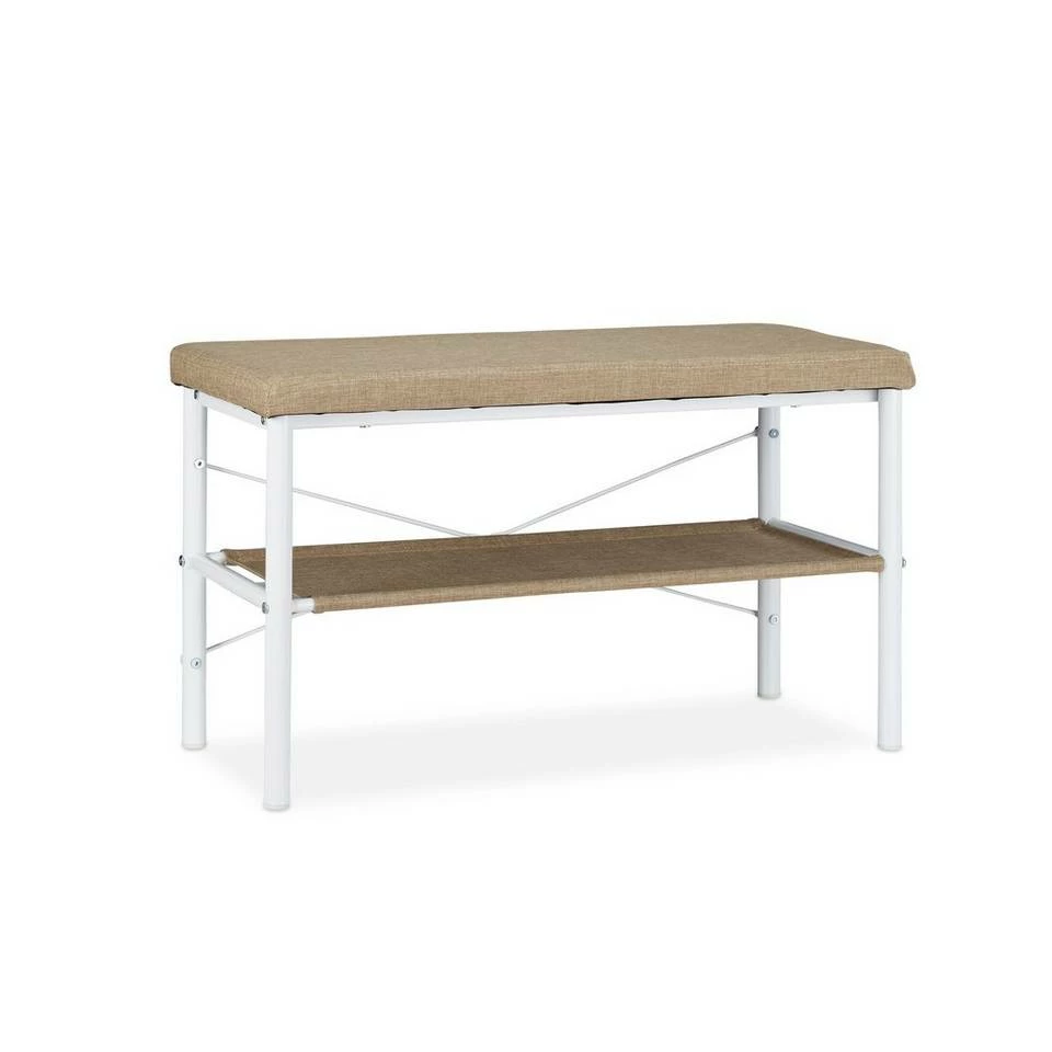 - Basics: Praktische Schuhbank aus weißem Eisen und beigem Stoff – Maße H x B x T: ca. 42 x 72 x 32