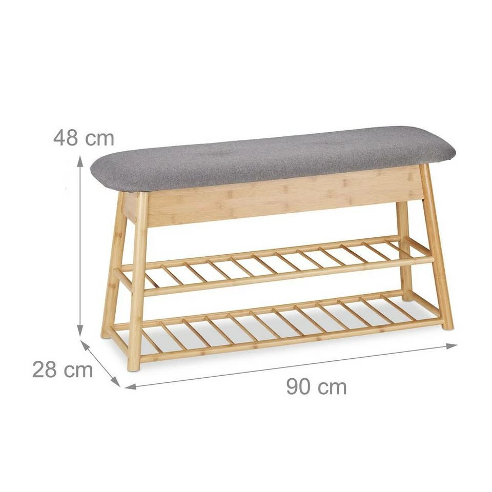 Schuhbank mit viel Stauraum Die schmale Flurbank mit viel Stauraum passt in jede Diele und bietet zugleich viel Stauraum für Schuhe und Accessoires. Die 2 Schuhablagen fassen zusammen bis zu 8 Paar Schuhe. Das bequeme Sitzpolster ist nicht nur eine praktische Sitzgelegenheit beim An- und Ausziehen der Schuhe, sondern auch ein Klappdeckel. In der Garderobenbank befinden sich 2 zusätzliche Fächer für Schuhputzzeug, Schals, Mützen und mehr. Das Schuhregal aus Bambus macht auch als Bettbank im Schlafzimmer eine gute Figur.