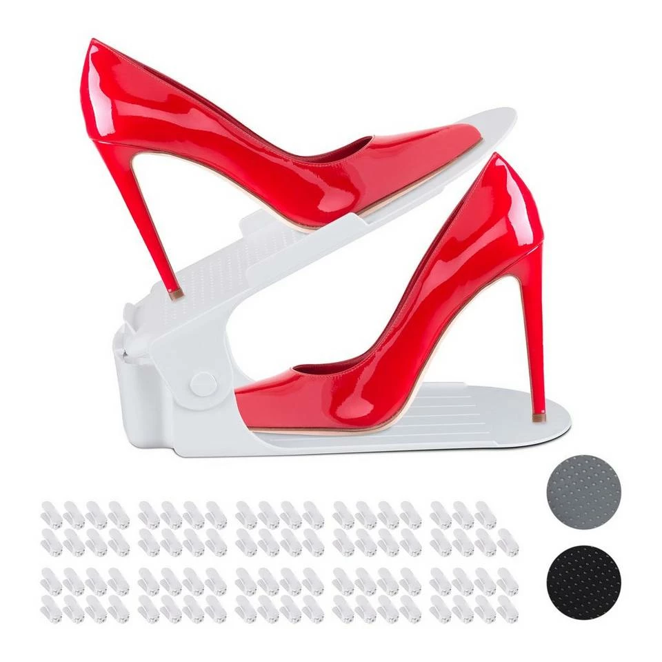 Platzsparende Schuhablagen für Ihren Kleiderschrank Im Eingangsbereich, Kleider- oder Schuhschrank sind diese Schuhstapler die idealen Ordnungshelfer. Sie verfügen über eine rutschfeste Ablagefläche & eignen sich für Schuhe bis zu Größe 39. Die Schuhablage aus Kunststoff verhindert dabei ein Verschmutzen von Boden oder anderer Schuhen. Die Schuhhalter sind im 80er Set erhältlich & dienen so besonders Paaren & Familien mit begrenzten Lagerungsmöglichkeiten. Dank der Verstellbarkeit eignen sich die Schuhorganizer neben flachen auch für hohe Schuhe.