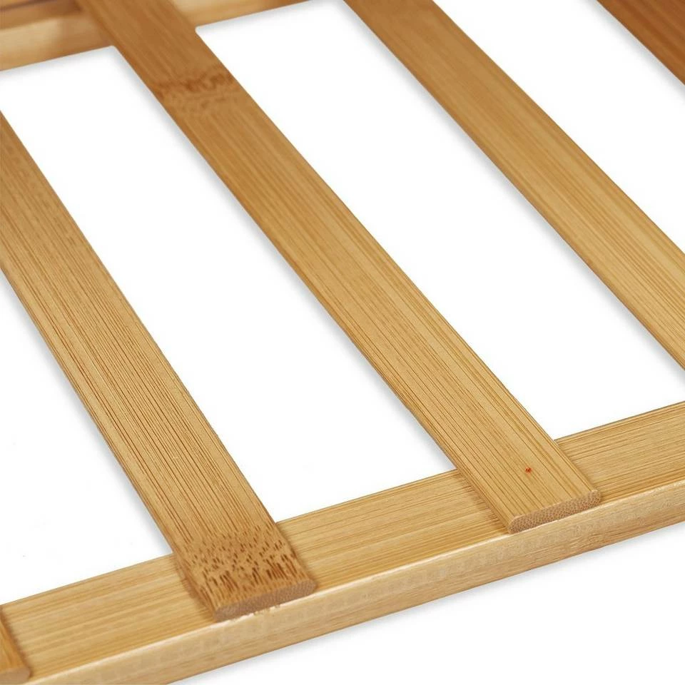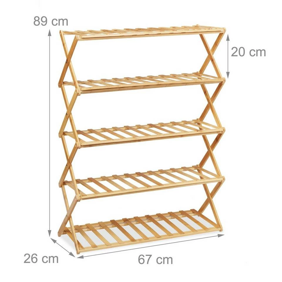 Schuhregal mit modernem Look Das schicke Schuhregal aus Bambus bietet auf seinen fünf Ebenen Aufbewahrung und Organisation für ca. 15 Paar Schuhe. Durch die schmale Form passt das Bambusregal perfekt in Diele und Flur. Dank dem genialen faltbaren Design kann der Schuhständer schnell und platzsparend verstaut werden. Dadurch ist die Schuhablage auch unterwegs im Wohnwagen und beim Camping immer dabei. Hier sorgt der Schuhturm für Ordnung im Zelt und Wohnmobil, damit ihre Schuhe, Stiefel und Sneaker nicht herumliegen.
