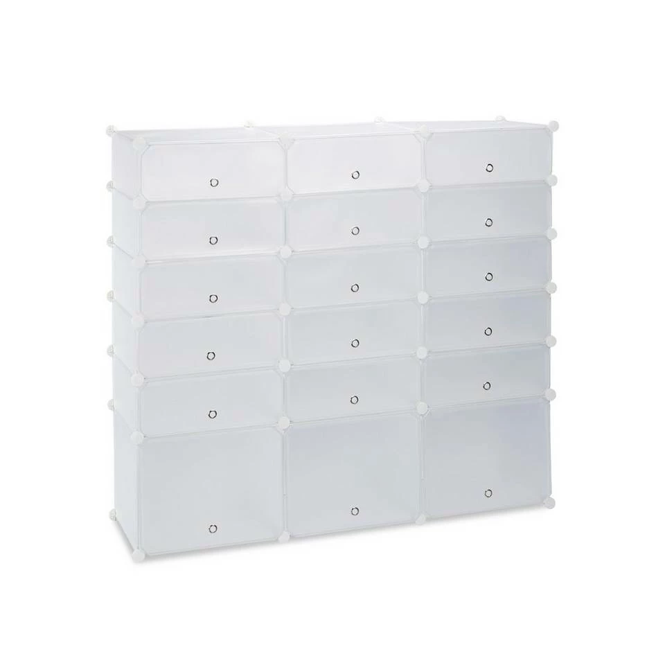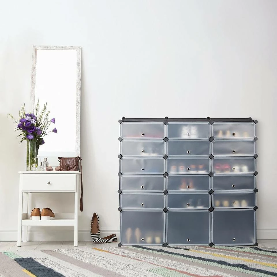 Regalsystem für die Schuhaufbewahrung Sie sind kein Fan schwerfälliger Schuhregale, die sich nur mithilfe vieler freiwilliger Hände bewegen lassen? Mit diesem Stecksystem ersparen Sie sich viel Stress. Die Wände, Böden und Türen lassen sich mithilfe der Steckverbindungen zusammenbauen – und zwar genau so, wie es Ihrem Geschmack entspricht. Mindestens 36 Paar Schuhe finden in dem Standregal Platz, das Sie mit oder ohne Türen nutzen können. In jedem Fall wissen Sie dank der transparenten Türen sofort, in welchem Fach sich Schuhe befinden. Die 3 größeren Fächer bieten sogar genügend Raum für Stiefel.