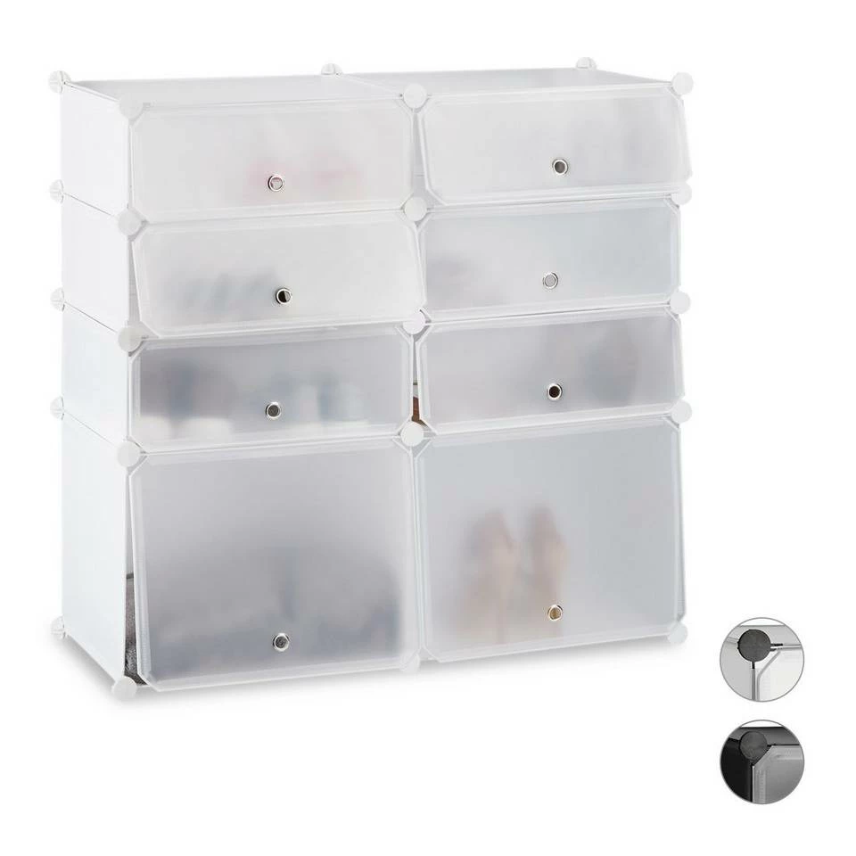 Kunststoff Schuhregal für viele Schuhe Der Schuhschrank zum Stecken ist ideal für die ganze Familie. Die besonders tiefen Fächer bieten Platz für große Schuhe oder für zwei Reihen Kinderschuhe. Durch die hohen Fächer finden auch Damenstiefel genügend Platz. Das praktische Regalstecksystem lässt sich einfach auf- und abbauen und kann durch die flexiblen Steckverbindungen auch in eine andere Form gebracht werden. Die abwaschbaren Kunststoffplatten sind gerade bei nassen Schuhen praktisch, da ein Reinigen schnell und leicht von der Hand geht.