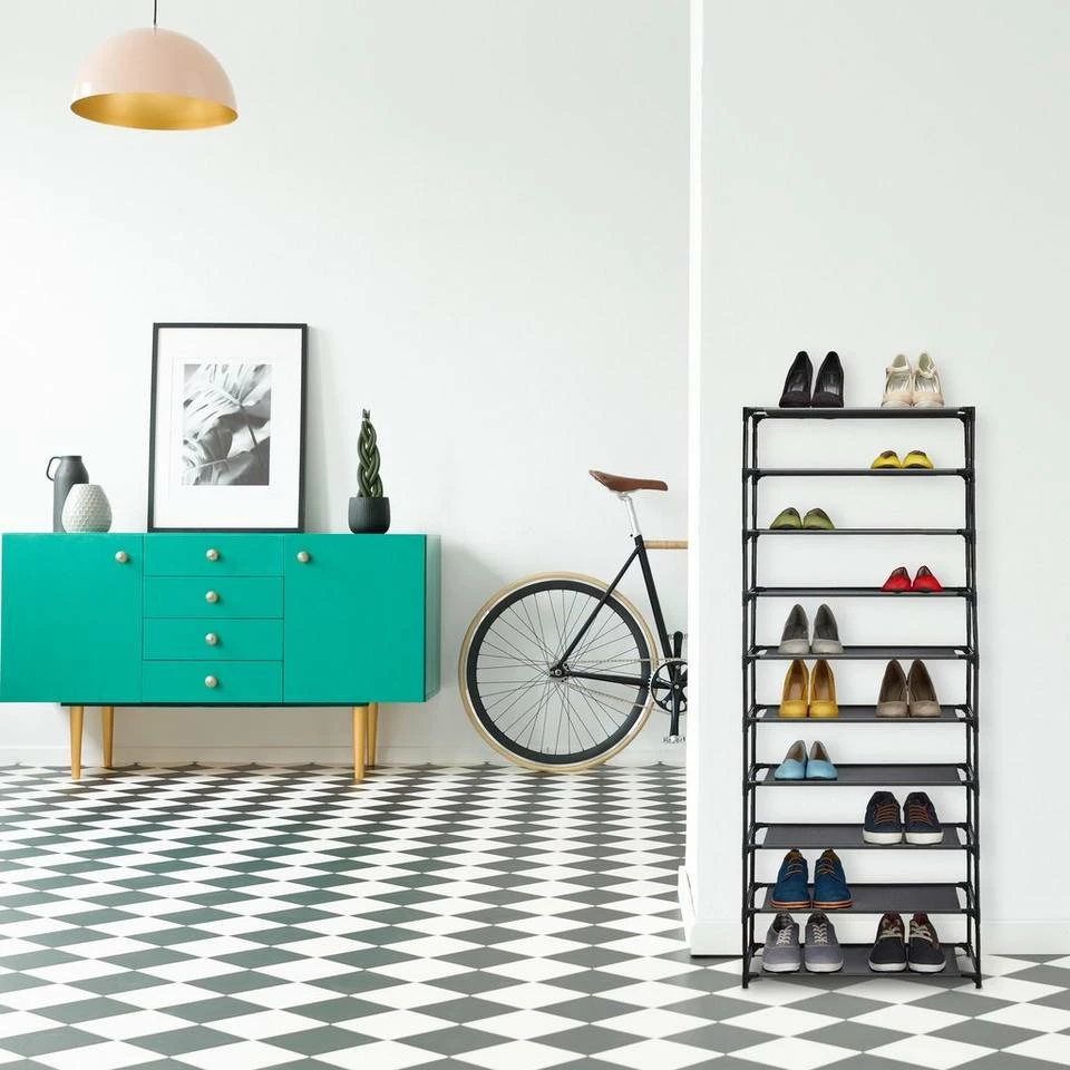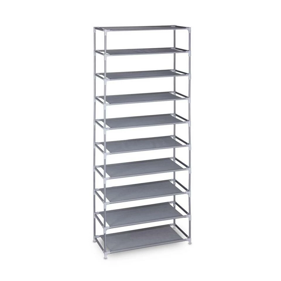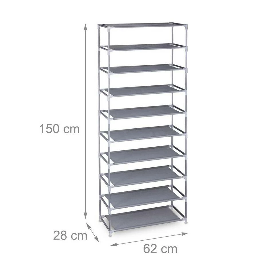 XXL Stoff Schuhregal für 30 Paar Schuhe Ob Sandaletten, Turnschuhe oder Ballerinas – oft hat man mehr Schuhe als gedacht. Leider ist der Platz in Wohnungen oft begrenzt. Durch den hohen Schuhständer haben Sie gleich 10 Ebenen auf den Sie all Ihre Schuhe problemlos unterbekommen. Auch mit Kindern oder in einem Mehrpersonenhaushalt bietet sich das XXL Schuhregal an. Das offene Design sorgt dafür, dass Sie alle Schuhe griffbereit haben und schnell finden. Das variable Steckregal lässt sich einfach aufbauen und die Ebenen auch verringern.