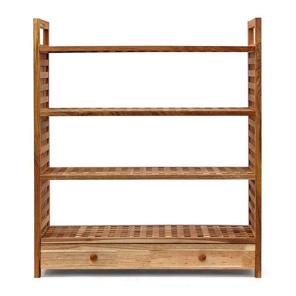 Schuhablage für Stauraum im Flur Schaffen Sie Platz für Ihr Schuhwerk und verstauen Sie es auf den 4 Ablagen dieses Schuhregals. Jede der Etagen bietet Platz für jeweils 3 Paar Schuhe, wobei auf dem obersten Boden auch Stiefel oder Winterschuhe abgestellt werden können. Besonders praktisch ist die ausziehbare Schublade, die sich ideal zum Aufbewahren von Schuhcreme, Einlegesohlen oder Politur eignet. Das Regal besteht aus geöltem Walnussholz, ist leicht und sehr robust. Mit dem natürlich hellen Holzbraun fügt es sich freundlich und dezent in Ihre Einrichtung.