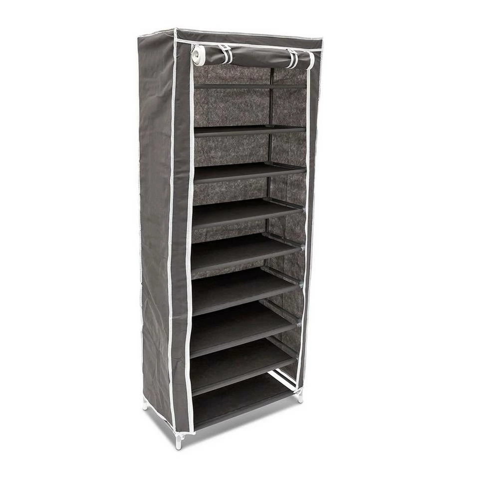 Der Schuhschrank mit Stoffbezug als Alternative zu teuren Möbeln Wollen Sie Ihre Schuhe von der Flurecke ordentlich in einen Schuhschrank räumen? Verzichten Sie auf teure Möbelstücke und nutzen Sie diesen praktischen Faltschrank als Ablagemöglichkeit. Der Stoffschrank bietet auf 9 Regalböden Platz für Sneakers, Sandalen, Halbstiefel und Stilettos. Der Schuhschrank eignet sich nicht nur für Flur und Diele, auch im Gartenhäuschen, im Keller oder Dachboden macht er eine gute Figur. Der Vorteil zum klobigen Schuhregal ist hier, dass Sie dank des Überzugs einfach Ordnung schaffen können, indem sie den Reißverschluss zuziehen.