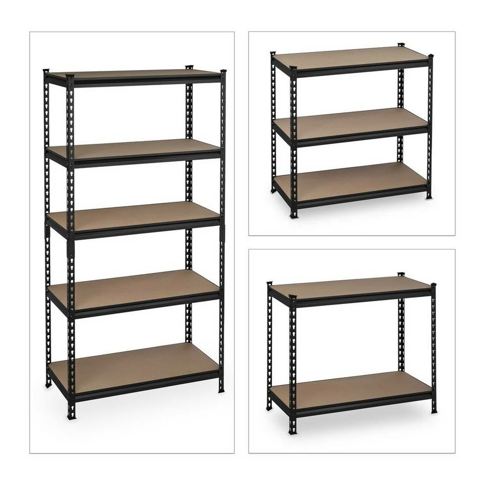 Massives Lagerregal zu Stecken Verstauen Sie Reifen, Werkzeuge, Lebensmittel und weitere schwere Gegenstände in diesem Steckregal. Das belastbare Regal aus Stahl und 5 MDF-Ablagen kann im Keller, der Speisekammer oder Garage genutzt werden. Dabei sind die Böden nach Belieben in der Höhe einstellbar. Bei Bedarf können Sie das Hochregal teilen und als praktische Werkbank verwenden. Das robuste Metallregal wird dank Stecksystem ohne Schrauben und Bohren im Handumdrehen aufgebaut. Tipp: Das praktische Stecksystem benötigt keinerlei Schrauben, daher funktioniert der Aufbau schnell und einfach. Eventuell benötigen Sie einen Gummihammer. Bauen Sie das Regal mit Handschuhen auf.