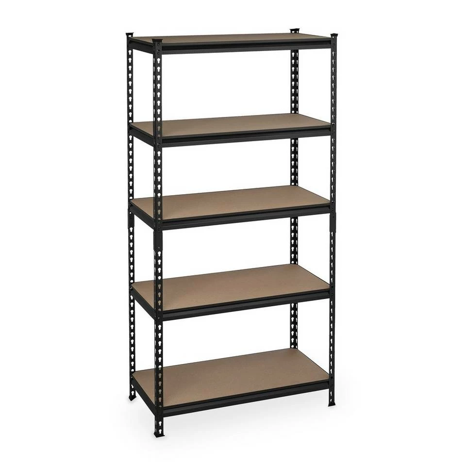 - Basics: Schwarzes Regal – Traglast gesamt: ca. 1800 kg – Je Ebene: ca. 360 kg – HBT: ca. 183x91x46 cm
