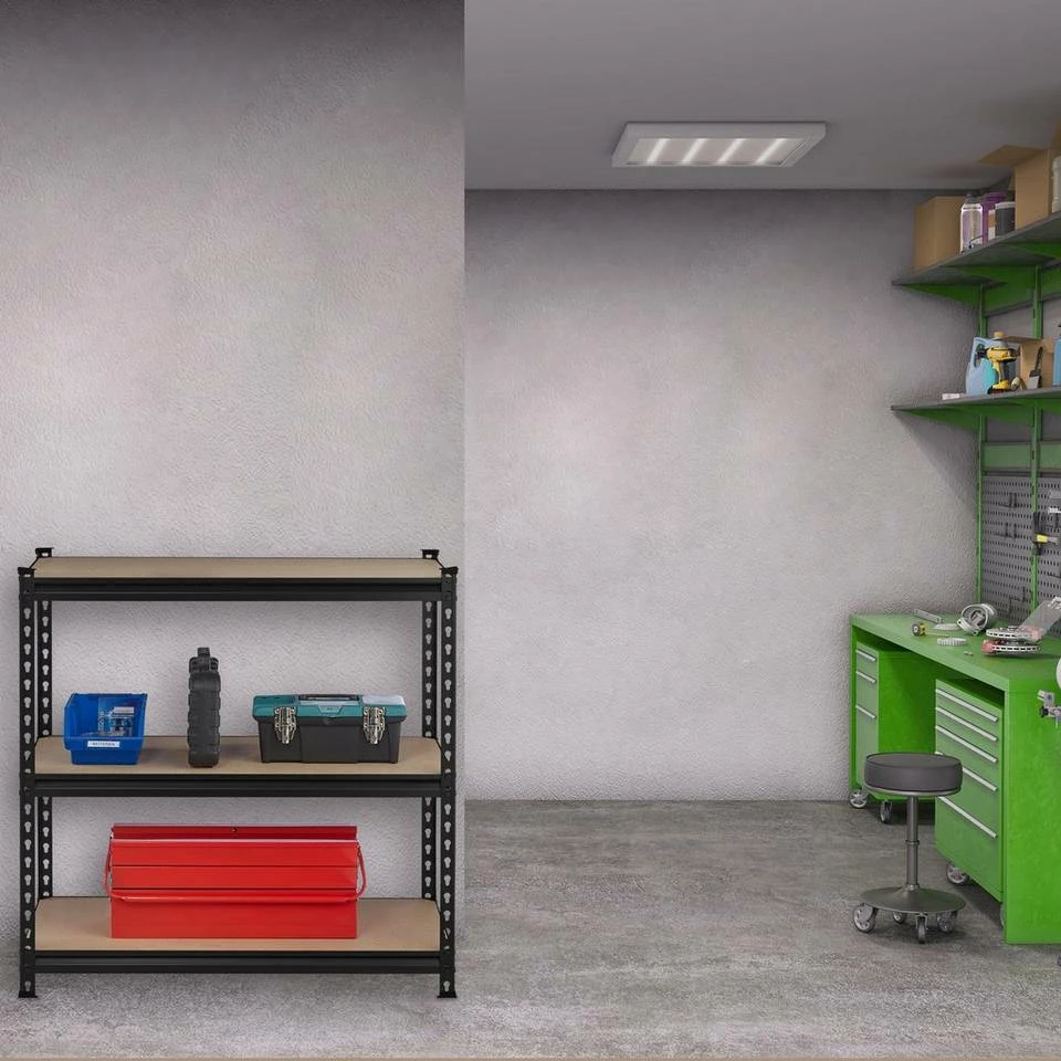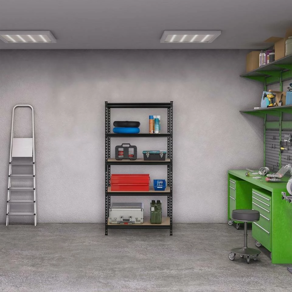 - Stauraum: Lagerregal aus Stahl und MDF für Garage, Werkstatt, Keller – Platz für Werkzeug, Getränke