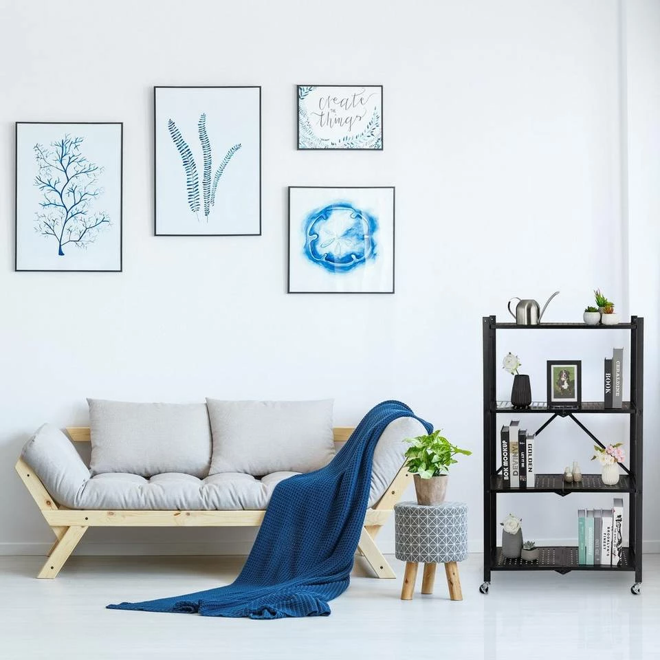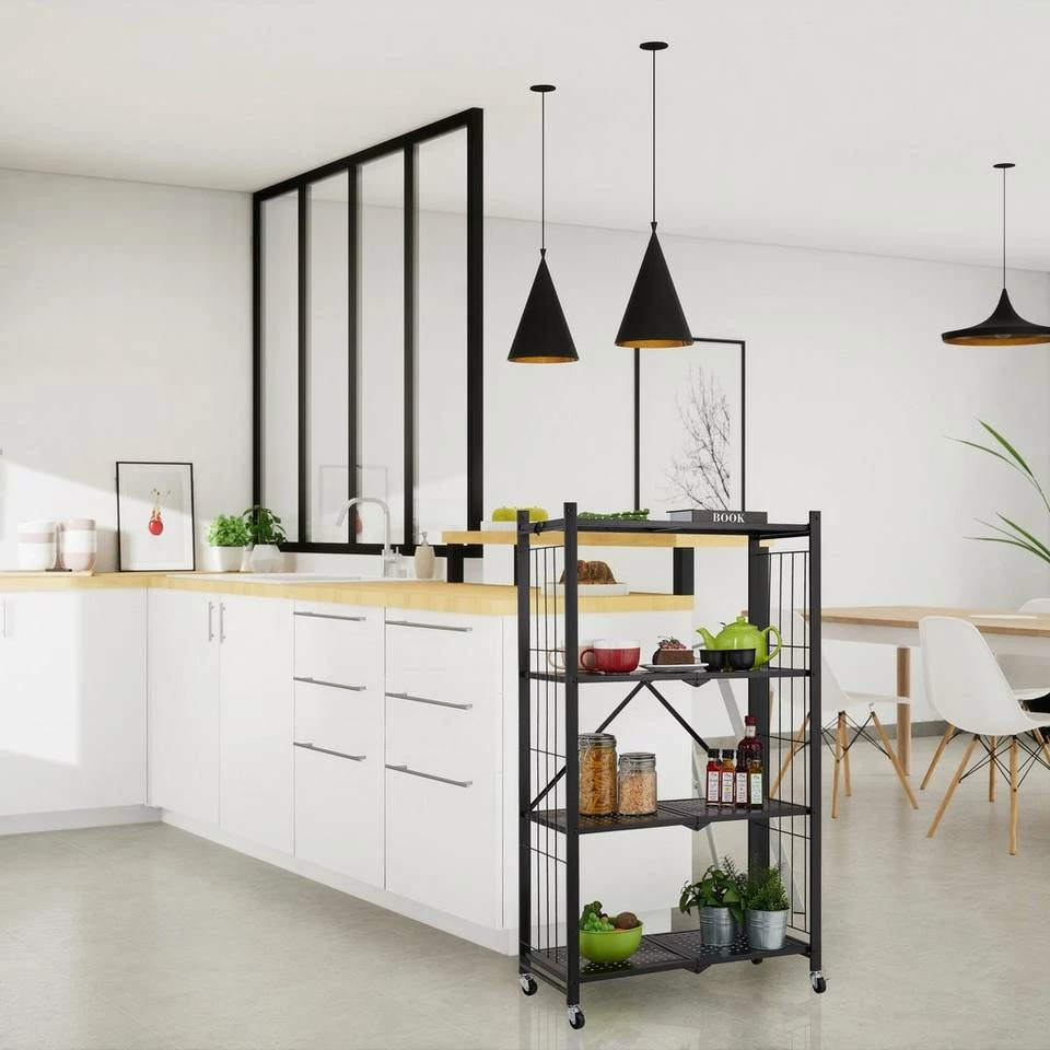 Klappbarer Küchenrollwagen mit 4 Ebenen Der Küchenwagen ist ein mobiler Ordnungshelfer für Ihr Zuhause. Das Klappregal verfügt über 4 Rollen, sodass Sie es dorthin schieben können, wo es gerade gebraucht wird. Der Regalwagen eignet sich hervorragend als zusätzliche Ablagefläche für Vorratsdosen, Flaschen und mehr in der Küche. Wenn Sie Gäste empfangen, macht das Rollregal als Servierwagen, mit dem Sie Speisen und Getränke stilvoll an den Tisch bringen, eine gute Figur. Der Aufbewahrungswagen eignet sich besonders für kleine Küchen, da er bei Nichtgebrauch platzsparend zusammengeklappt und verstaut werden kann.