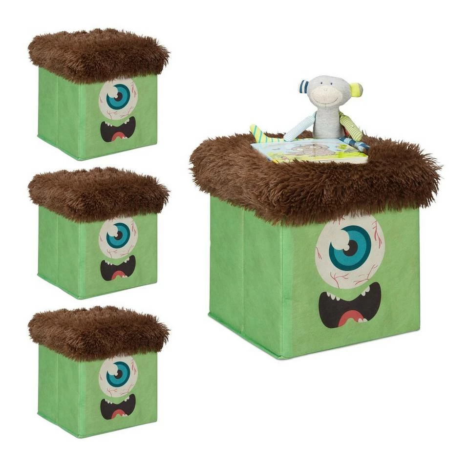 - Set: 4 x grüner Spielzeughocker im Monster-Design – Flauschiger Deckel – Hingucker im Kinderzimmer
