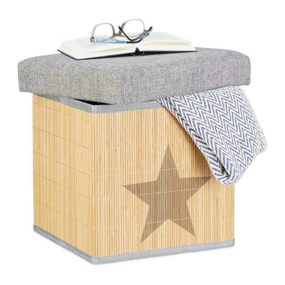 Faltbarer Sitzhocker im Bambus Look Der große Stauraum des faltbaren Sitzhockers lässt sich mit vielen verschiedenen Gegenständen wie Büchern, Decken oder CDs befüllen. Der Hocker überzeugt durch eine ausgefallene Bambus-Optik mit Stern-Aufdruck und sorgt für ein natürliches Flair. Der Polsterhocker mit 2in1 Funktion kann als Aufbewahrungsbox und als Sitzgelegenheit genutzt werden. Besteht einmal Platzbedarf, dann ist der Sitzwürfel mit wenigen Handgriffe zusammengefaltet und weggeräumt. Der Bezug aus widerstandsfähige Stoff ist einfach zu reinigen und zu pflegen.