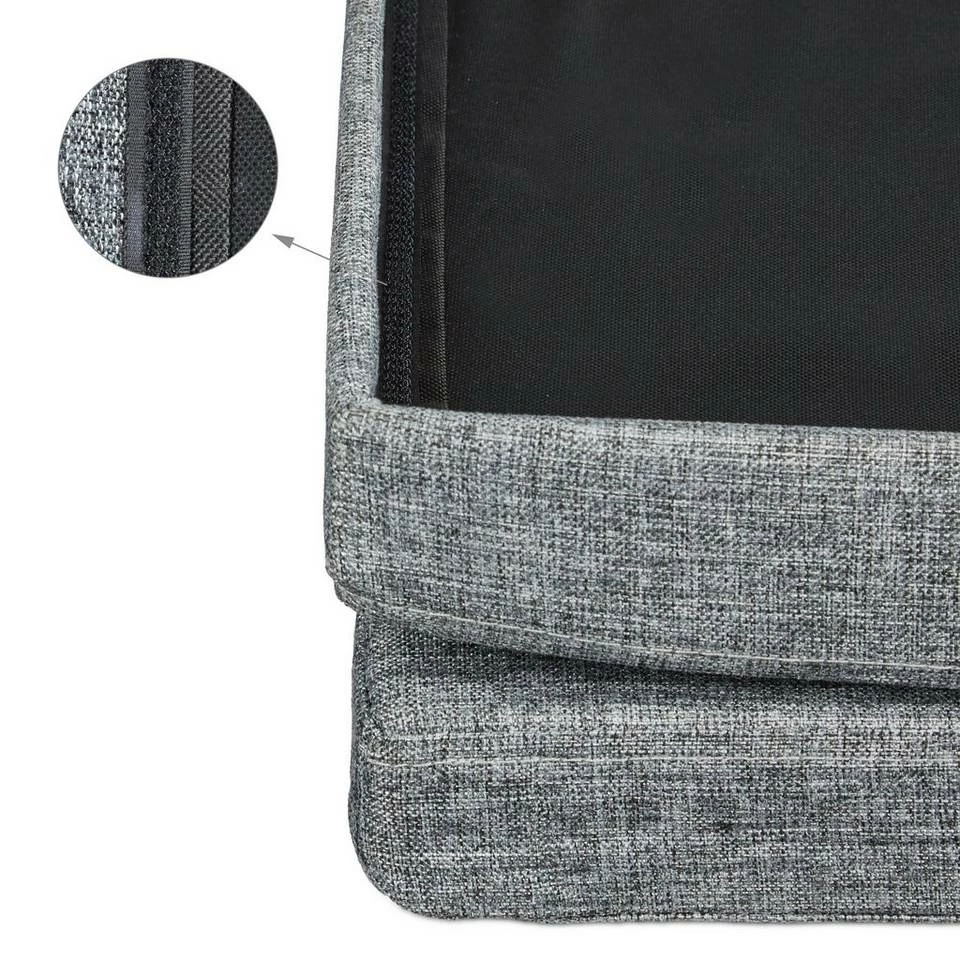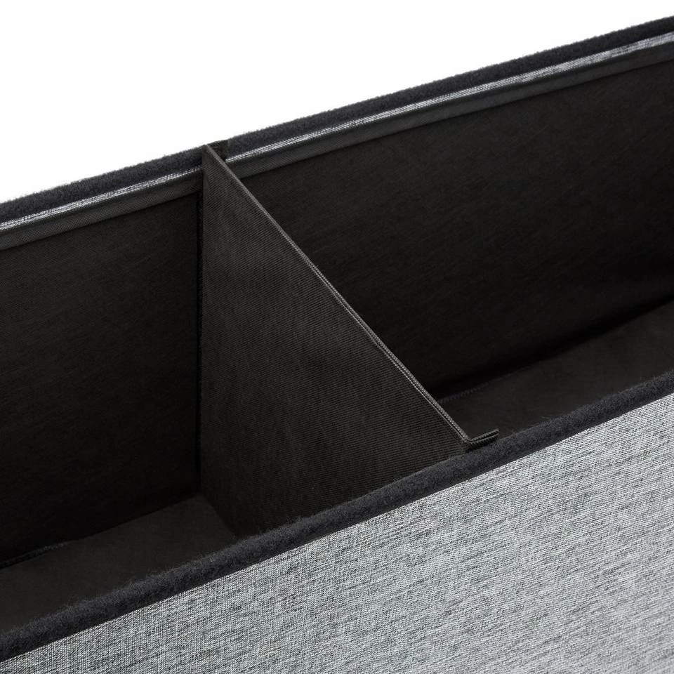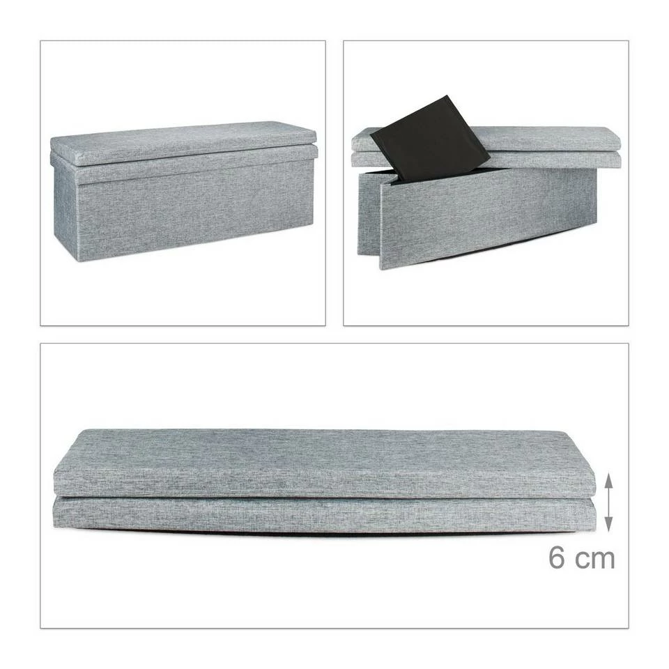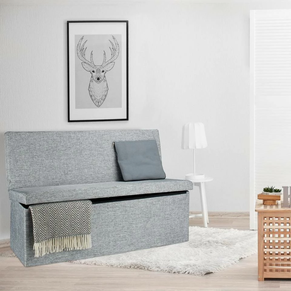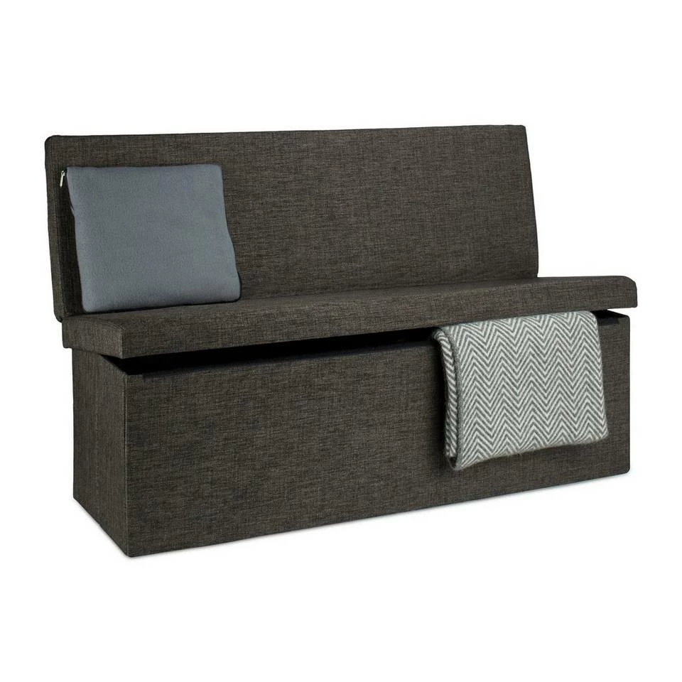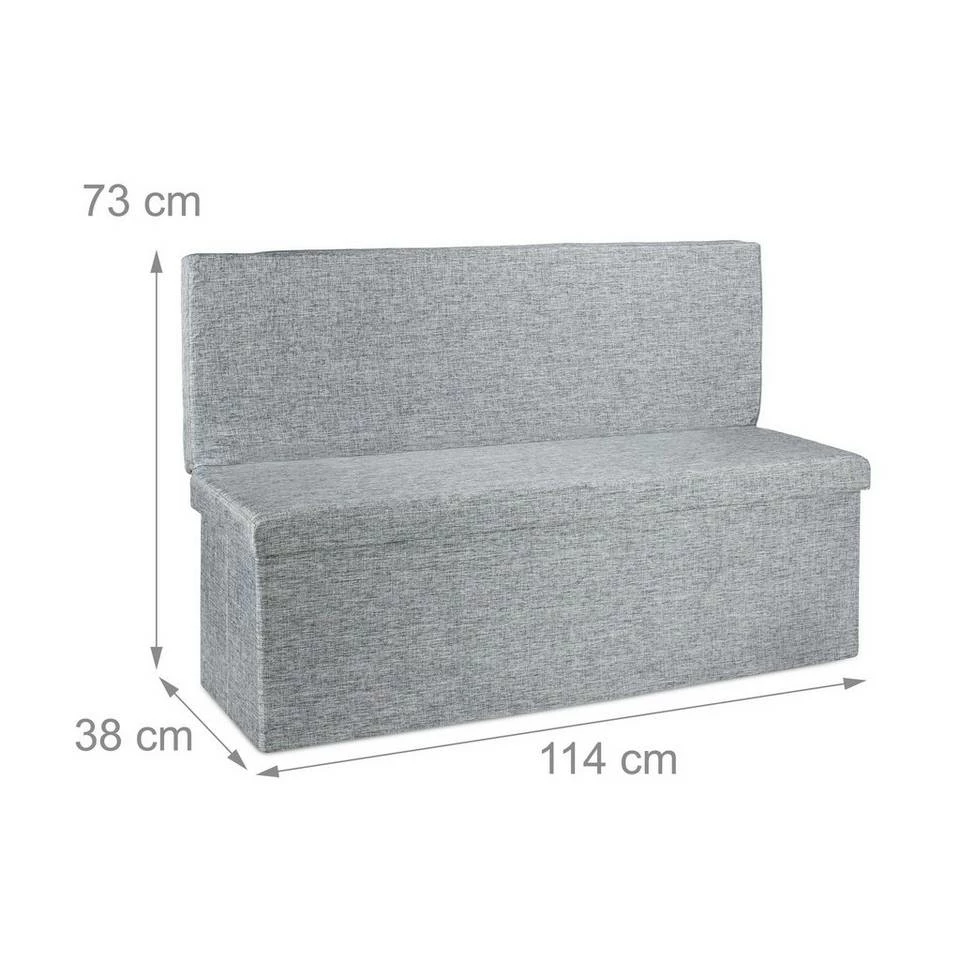 Faltbare Sitzbank mit Lehne Diese praktische Sitzbank bietet einen sehr großen trennbaren Stauraum von ca. 140 Litern. In der hochwertigen Bank sind Zeitschriften, Bücher und anderen Gegenstände fix untergebracht. Die 1,14 m breite Sitzbank ist darüber hinaus ideal für Familienfeiern und Partys geeignet. Mehrere Personen finden auf ihr Platz und die aufklappbare Lehne gibt zusätzlichen Komfort und Sicherheit. Der belastbare Sitzbezug ist aus dem natürlichen Stoff Leinen gefertigt und verleiht der Sitzbank einen besonderen Charme.