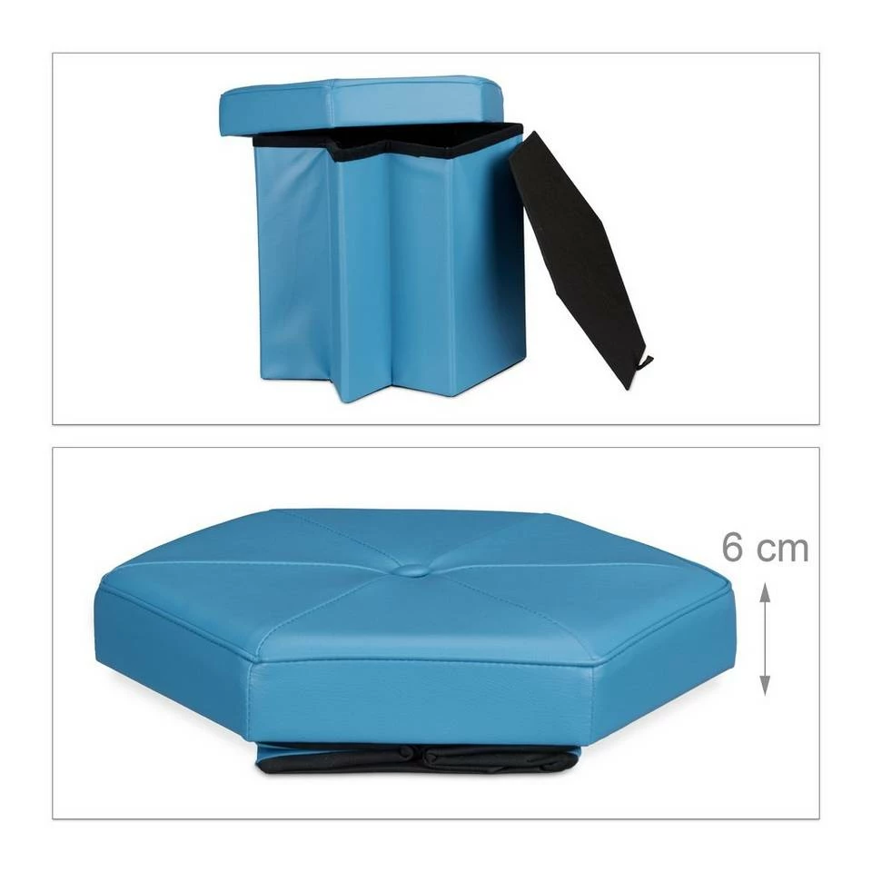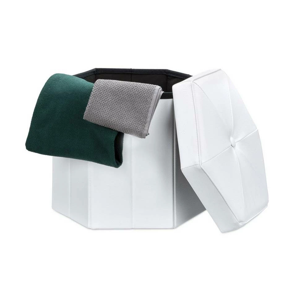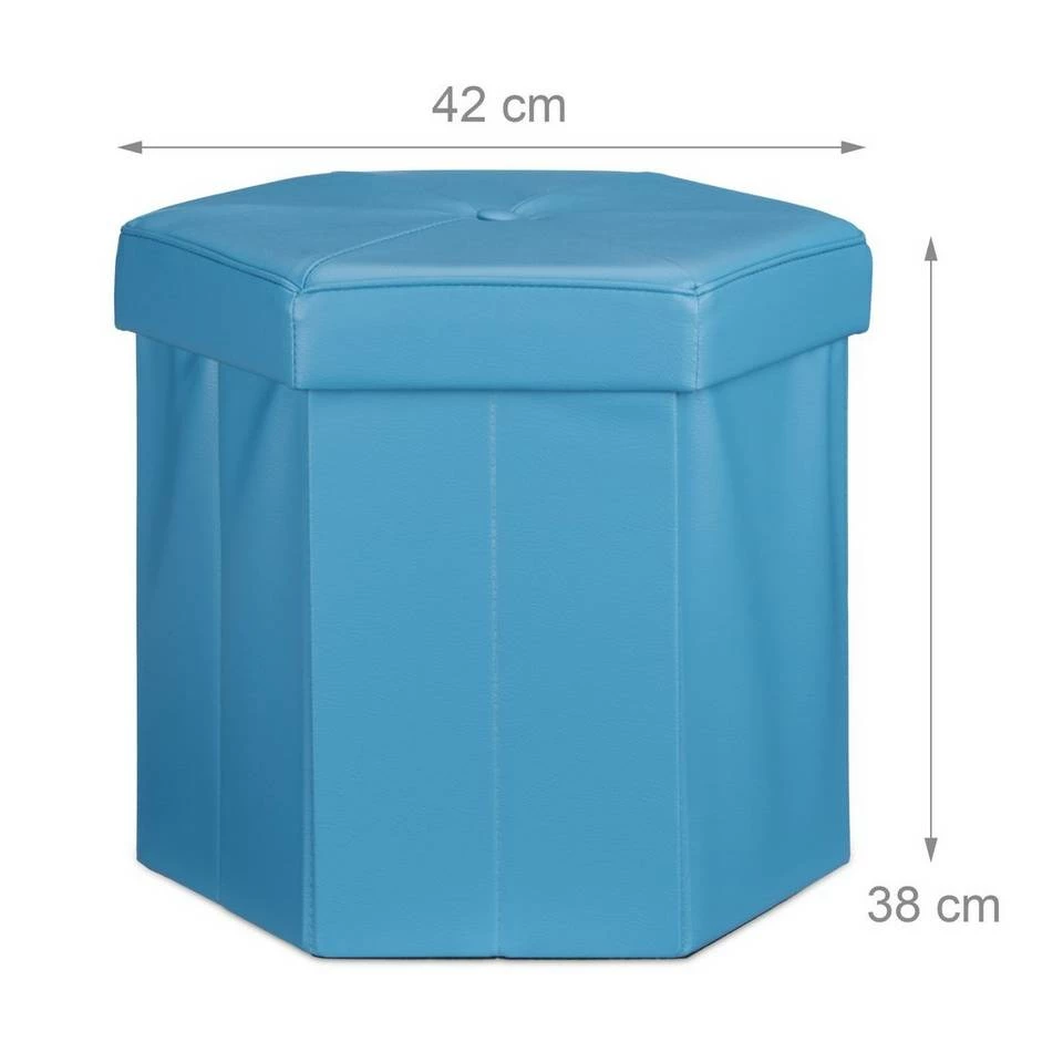 Faltbarer Sitzhocker sechseckiger Kunstleder Der sechseckige Sitzhocker ist perfekt, um Sitzmöglichkeiten und Stauraum intelligent miteinander zu verbinden. Mit 40 L Innenraum sind Bücher und Kleinkram und vieles mehr schnell untergebracht. Das verwendete Kunstleder des Sitzhockers ist hochwertig und stellt einen Hingucker dar. Die Polsterung ist angenehm und so auch für längeres Sitzen geeignet. Der Hocker kann platzsparend verstaut werden und steht in verschiedenen Farbvarianten zur Verfügung.