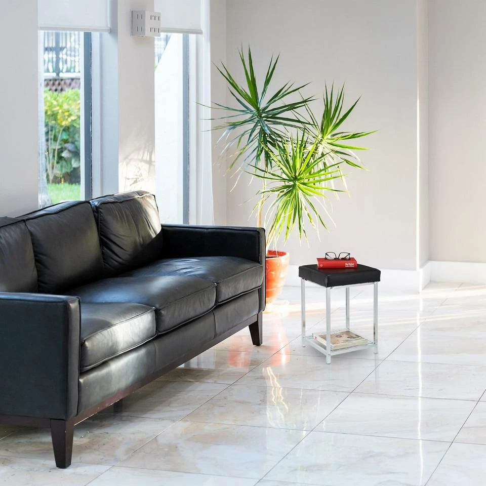 Dekorativer Beistellhocker in Lederoptik Der platzsparende Fußhocker aus verchromtem Metallgestell und schwarzem Bezug in Lederoptik setzt elegante und moderne Akzente in Deiner Einrichtung. Ein Highlight ist die Ablagefläche, welche Platz für Zeitschriften, Bücher und vieles mehr bietet. Der Polsterhocker eignet sich als Sitzgelegenheit im Wohnzimmer und Flur, aber auch als Fußablage vor dem Sofa ist der Beistellhocker ideal. Durch die Kunststoffkappen an der Unterseite ist er zudem schonend zu Deinem Fußboden.