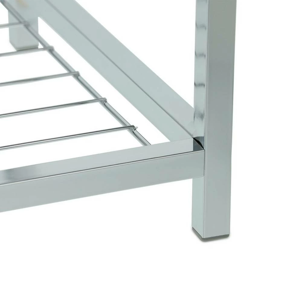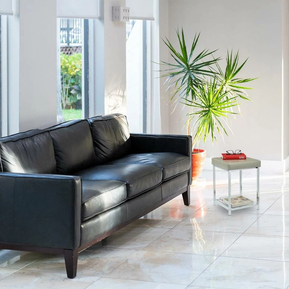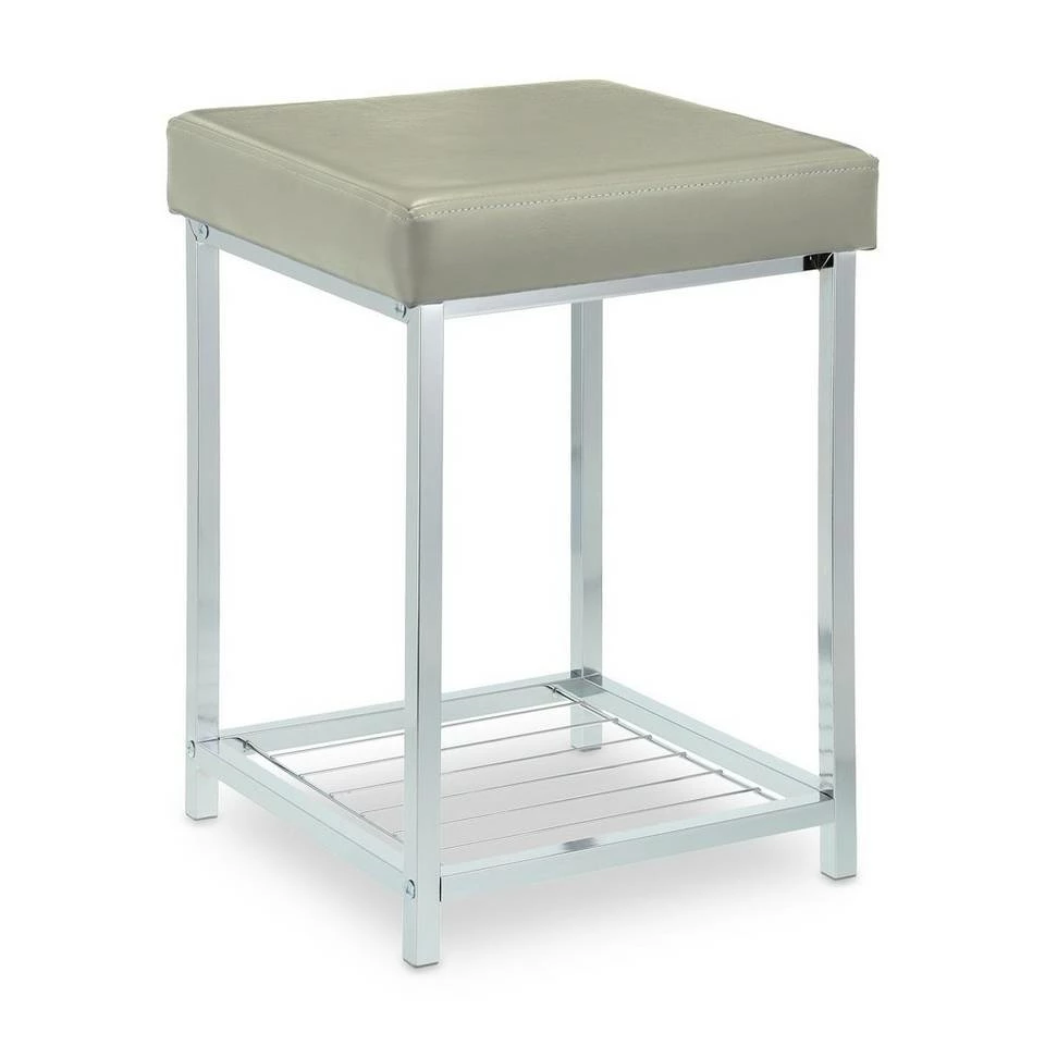 Dekorativer Beistellhocker für den Wohnbereich Der platzsparende Fußhocker aus verchromtem Gestell und grauem Kunstlederbezug setzt elegante und moderne Akzente in Deiner Einrichtung. Ein Highlight ist die Ablagefläche, welche Platz für Zeitschriften, Bücher und vieles mehr bietet. Der Polsterhocker eignet sich als Sitzgelegenheit im Wohnzimmer und Flur, aber auch als kleine Fußablage vor dem Sofa ist der Beistellhocker ideal. Durch die Kunststoffkappen an der Unterseite ist er zudem schonend zu Deinem Fußboden.