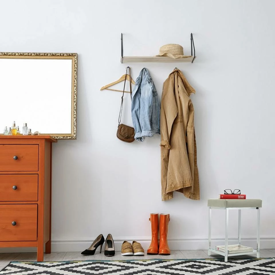 - Details: Platzsparender Dielenhocker aus Stahl, PVC und PP – Maße H x B x T: ca. 47 x 33 x 33 cm