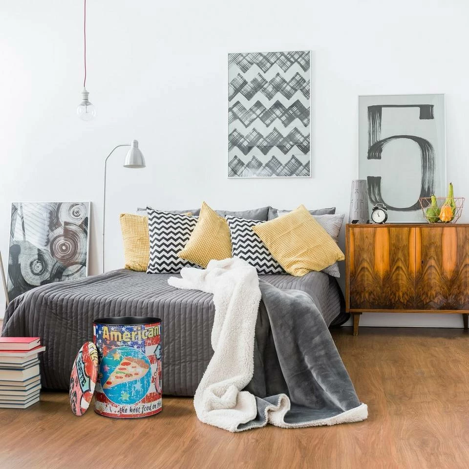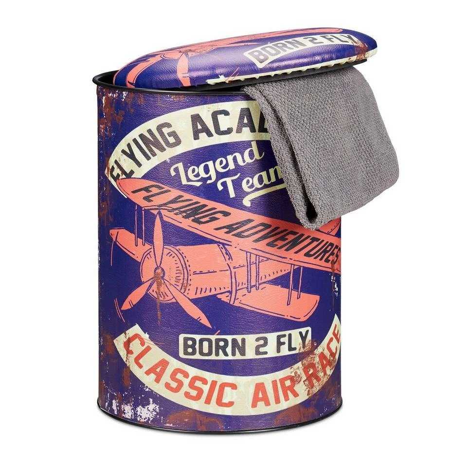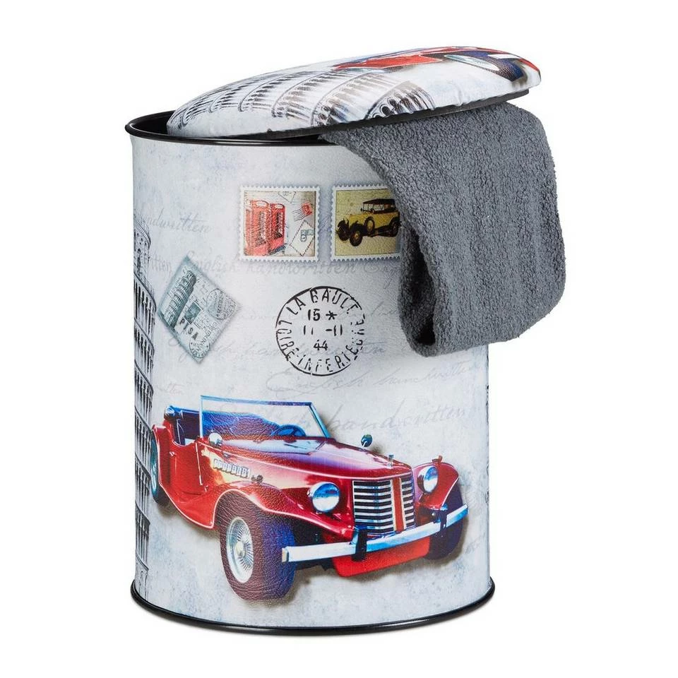 Vintage Sitztonne für Retro Flair daheim Die bequeme Sitztonne im Vintage Stil bringt mit ihren ansprechenden Motiven Retro-Flair in die eigenen vier Wände. Der runde Sitzhocker aus Metall ist mit PVC-Leder bezogen und mit Collagen aus diversen Motiven bedruckt. Wählen Sie zwischen romantischem Design und Shabby Chic Look. Der Polsterhocker ist gleichzeitig eine Aufbewahrungsbox für die Dinge des Alltags, wie Kuscheldecken, Spielsachen und vieles mehr. Ohne Deckel wird aus dem Wohnaccessoire ein dekorativer Papierkorb, der jederzeit in eine Sitzgelegenheit verwandelt werden kann.