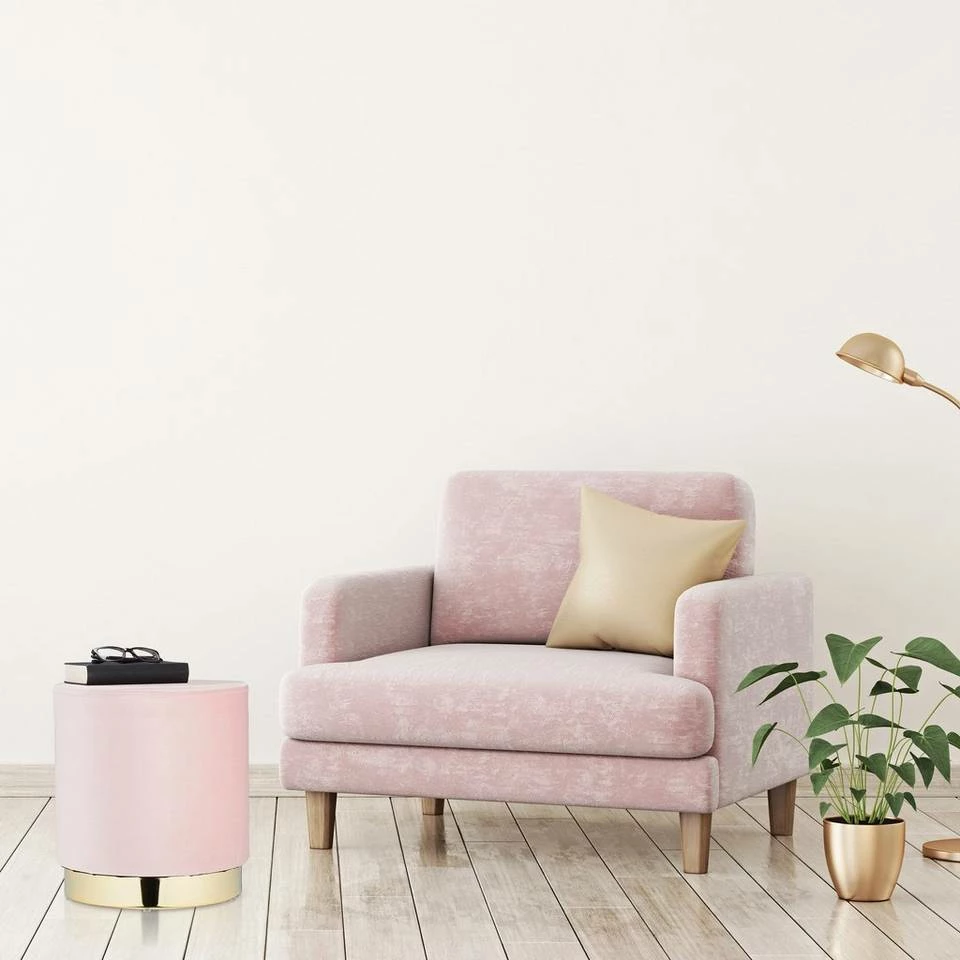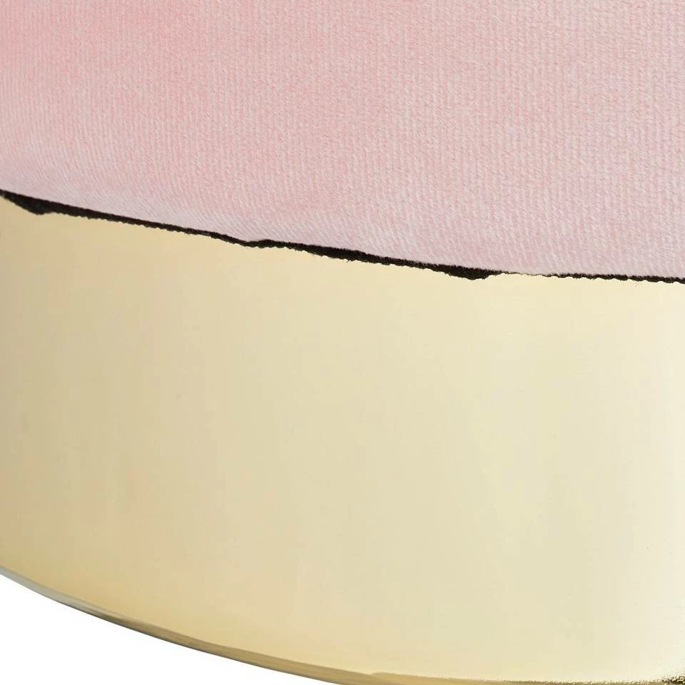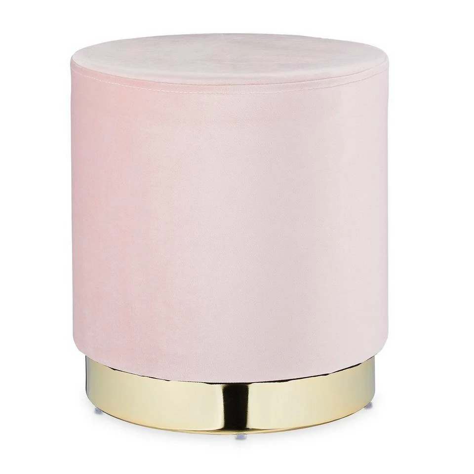 - Elegant: Kombination aus rosa Samt und Metallsockel in Gold macht Sitzpouf zu glamourösem Eyecatcher