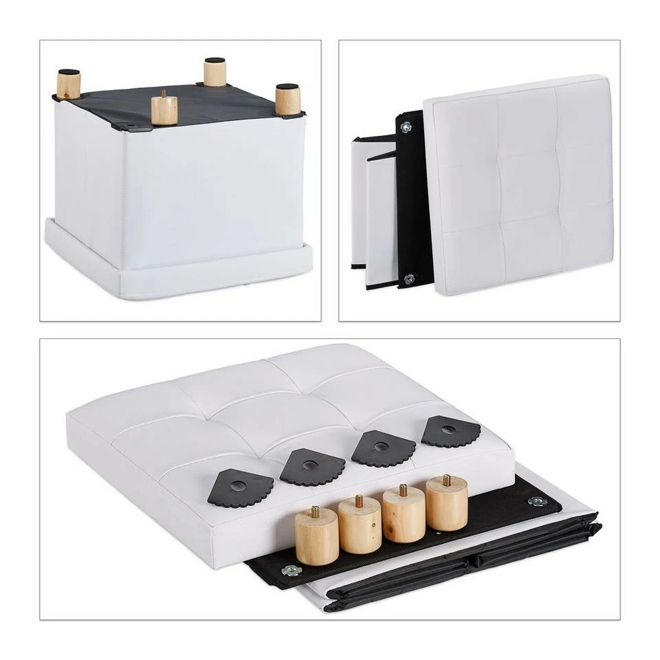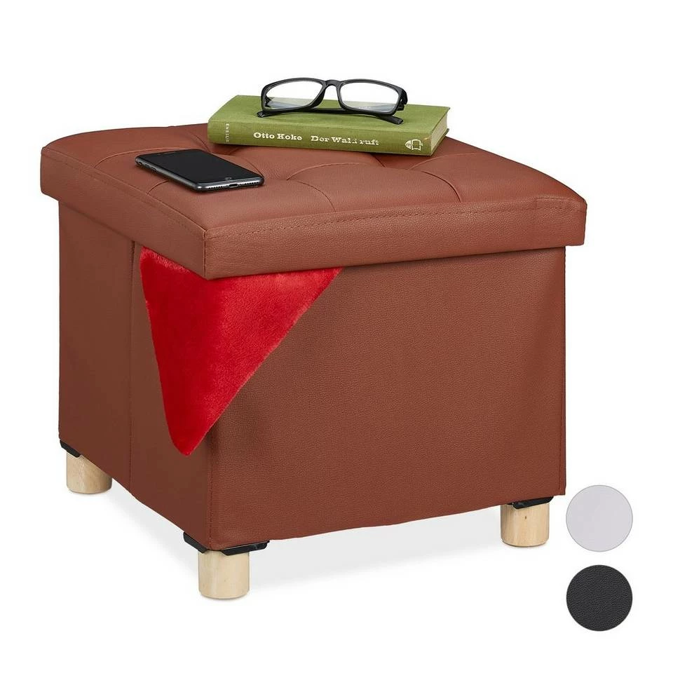 Sitzhocker mit Stauraum in elegantem Design Der Sitzwürfel ist ein echtes Multi-Talent. Die weich gepolsterte Sitzfläche sorgt nicht nur für ein angenehmes Sitzgefühl, als Deckel lässt sie sich gleichzeitig abnehmen und verwandelt die Sitzbox in einen praktischen Aufbewahrungshocker. Im Inneren können Decken oder Zeitschriften schnell verstaut werden. Aber auch als großzügige Fußablage macht der Würfelhocker eine gute Figur. Die Beine mit natürlicher Holzmaserung setzen in jedem Fall dekorative Akzente zum eleganten Kunstleder.