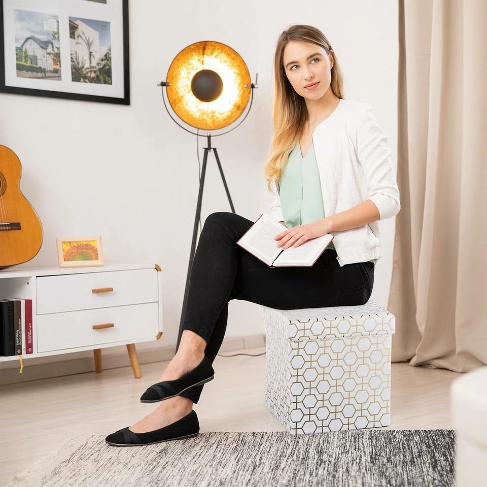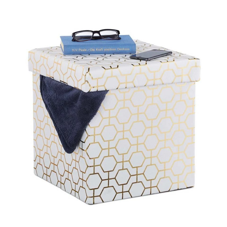 Faltbarer Sitzwürfel mit geometrischem Muster Ob als Sitzgelegenheit für spontanen Besuch oder als gemütlicher Fußhocker, der stilvoll gemusterte Sitzwürfel in Weiß und Gold bringt Eleganz ins Wohnzimmer. Das geometrische Muster im Art Deco Stil erinnert an das alte Hollywood und sorgt für Glamour in den heimischen vier Wänden. Der faltbare Polsterhocker mit Deckel verfügt über einen großen Stauraum und dient somit zugleich als Aufbewahrungsbox. Praktisch und schick passt der Sitzhocker insbesondere in helles Interior.