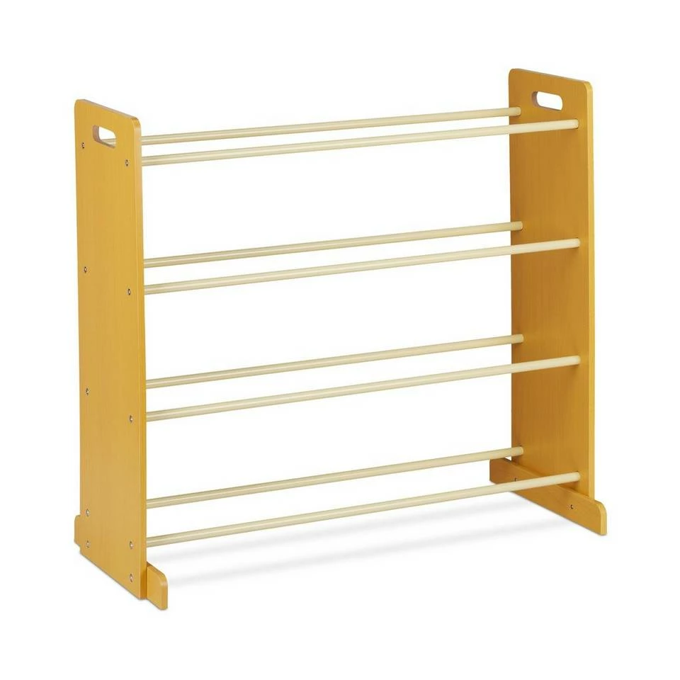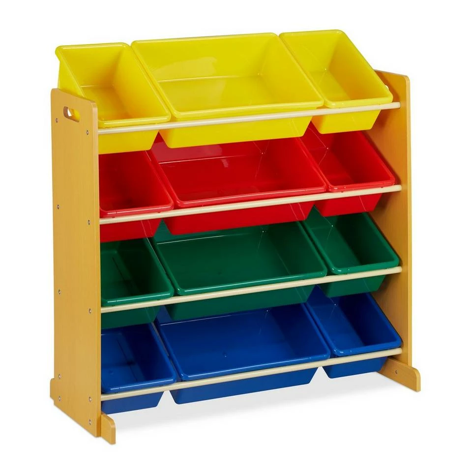 Spielregal mit Boxen für Ordnung im Kinderzimmer Wenn Ihre Kleinen mal wieder beim phantasievollen Spielen das Kinderzimmer verwüstet haben, hilft Ihnen dieses bunte Spielzeugregal im Nu für Ordnung zu sorgen. In den 12 Aufbewahrungsboxen können Kuscheltiere, Puppen, Bausteine und mehr ordentlich verstaut werden. Dank der 4 Etagen und der schrägen Anordnung der Kisten haben Sie jederzeit einen guten Überblick über die Spielsachen. Die Höhe des Aufbewahrungsregals ermöglicht den Kindern dabei, die einzelnen Kisten selbst zu entnehmen.