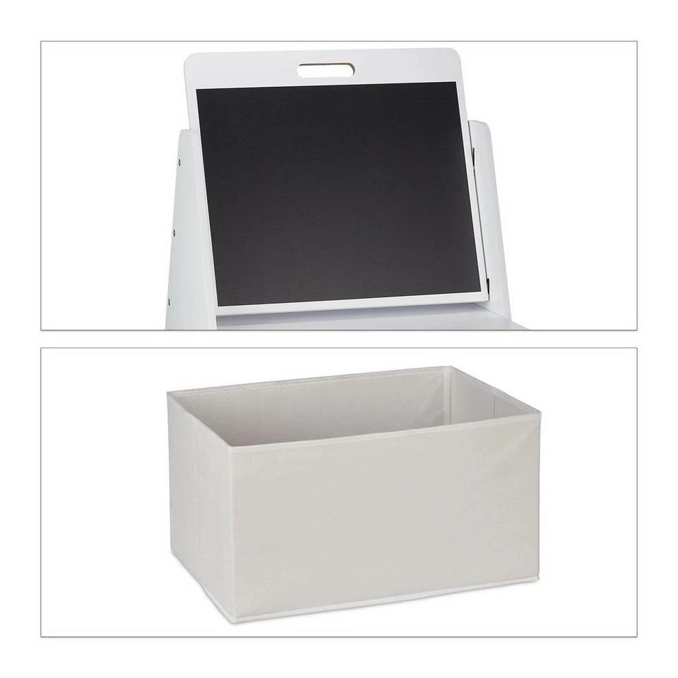 Schreibtafel und Spielzeugaufbewahrung für das Kinderzimmer Das weiße Spieleregal verbindet praktischen Stauraum mit einer kleinen Mal-Ecke aus Kindertafel & Ablage, an der sich Jungen & Mädchen kreativ austoben können. Dafür kann die Spieltafel in 3 verschiedenen Winkeln eingestellt werden. Sämtliches Zubehör, aber auch andere Spielsachen wie Kuscheltiere, Bauklötze & mehr finden in der Aufbewahrungsbox einen Platz. Die zwei Hängefächer aus Stoff eignen sich ideal zum Verstauen von Kinderbüchern, Leseheften oder Malbüchern.