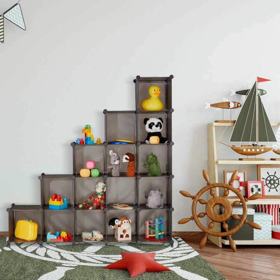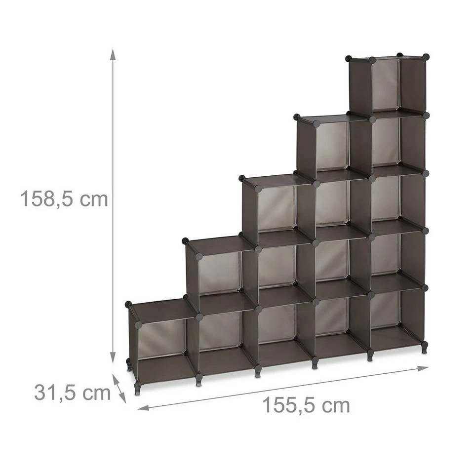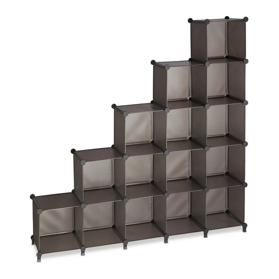 Erweiterbares Steckregal mit 15 Würfeln Wenn Du keine Lust auf schwere, massive Möbel hast, ist dieses flexible Regalsystem mit 15 Fächern zu empfehlen. Die Komponenten bestehen aus pflegeleichtem Kunststoff und sind mit Metall verstärkt. Dank des einfachen Stecksystems kannst Du das Kunststoffregal schnell und einfach aufbauen. Ob als Stufenregal unter Dachschrägen, als Bücherregal im Wohnzimmer oder zur Aufbewahrung von Spielzeug im Kinderzimmer: Stecke das Würfelregal auf deinen Bedarf abgestimmt jederzeit individuell zusammen.