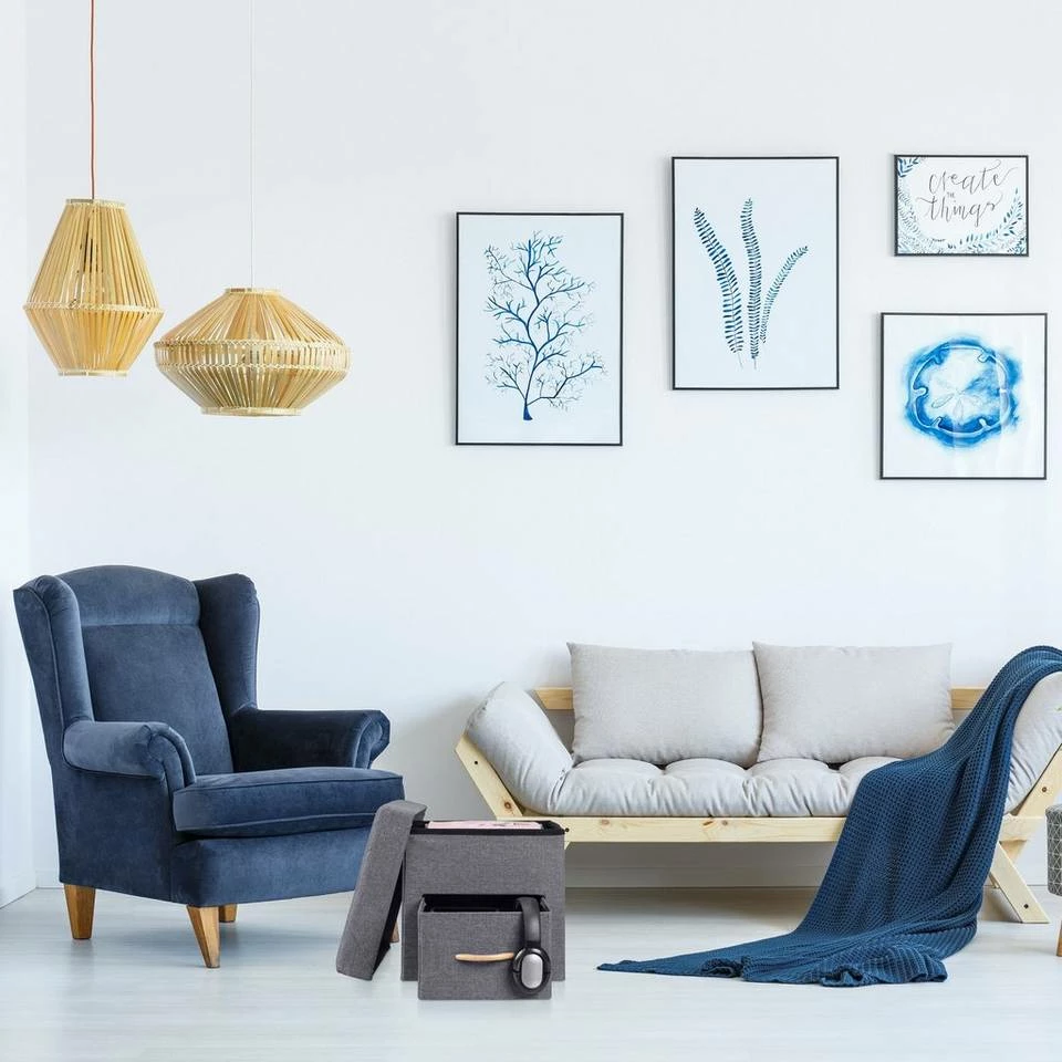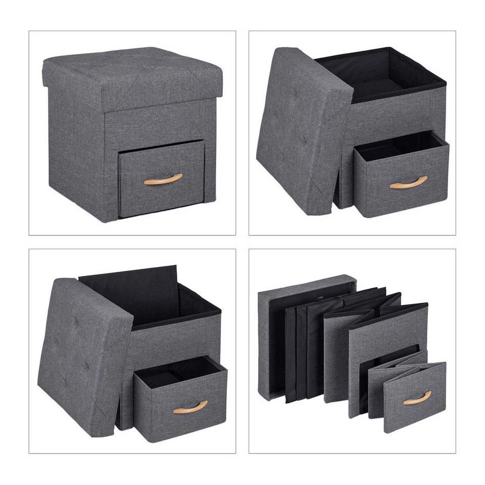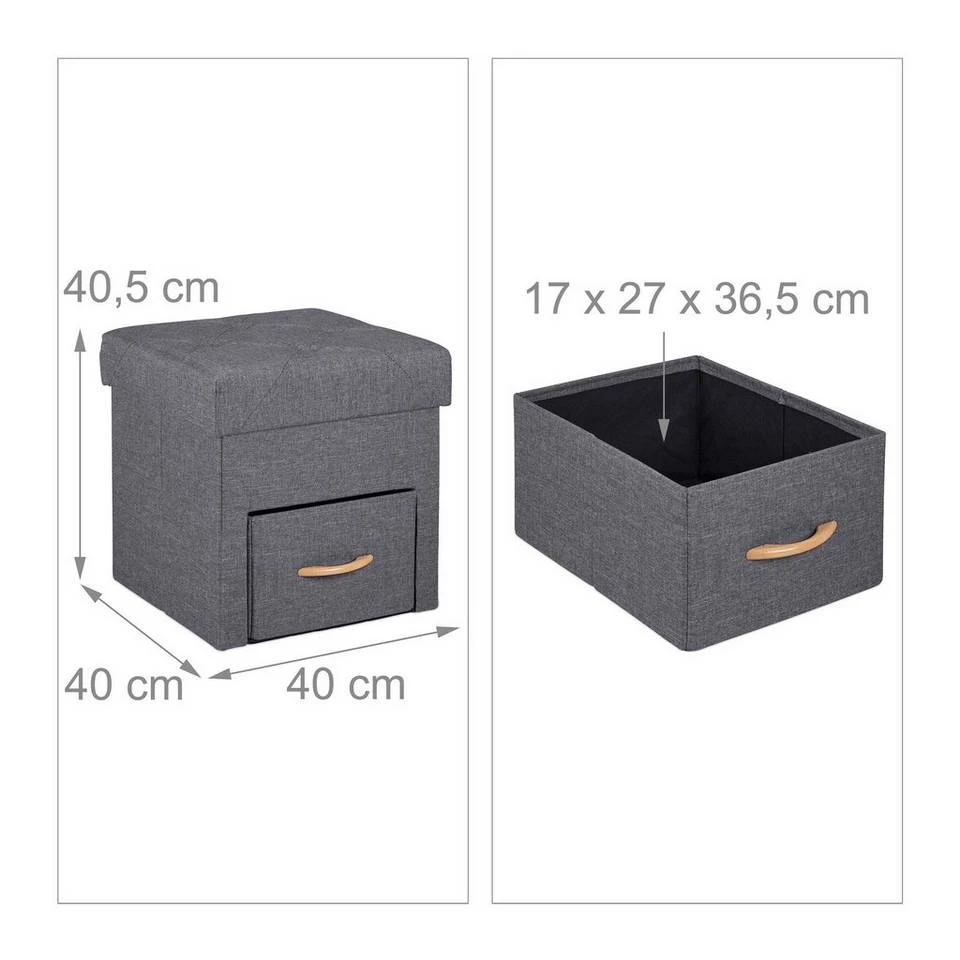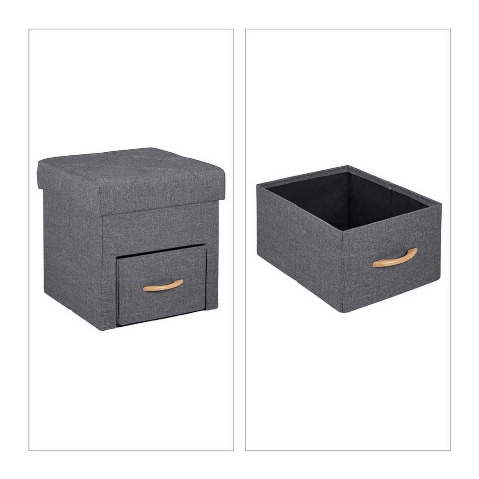 Grauer Sitzwürfel mit Schublade und Fach Dieser vielseitige Hocker ist nicht nur eine bequeme Sitzgelegenheit, er bietet dank Innenfach und Schublade auch Stauraum für Zeitschriften, Bücher, Fernbedienungen und allerlei Kleinkram. Der gepolsterte Deckel sorgt für einen hohen Sitzkomfort, ist aber auch als Ablage für die Füße nach einem langem Arbeitstag die richtige Wahl. Der Würfelhocker überzeugt optisch mit seinem Deckel mit Steppung und dem grauen Stoffbezug in Leinenoptik.