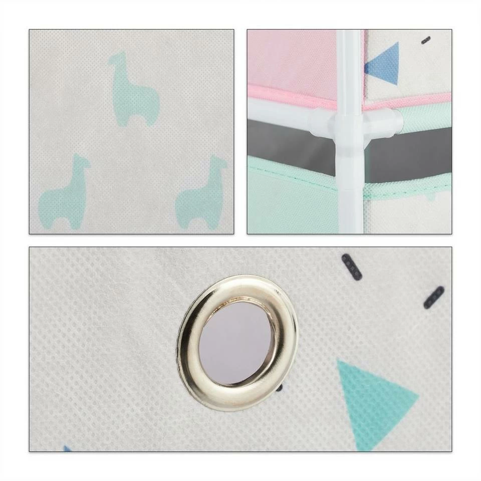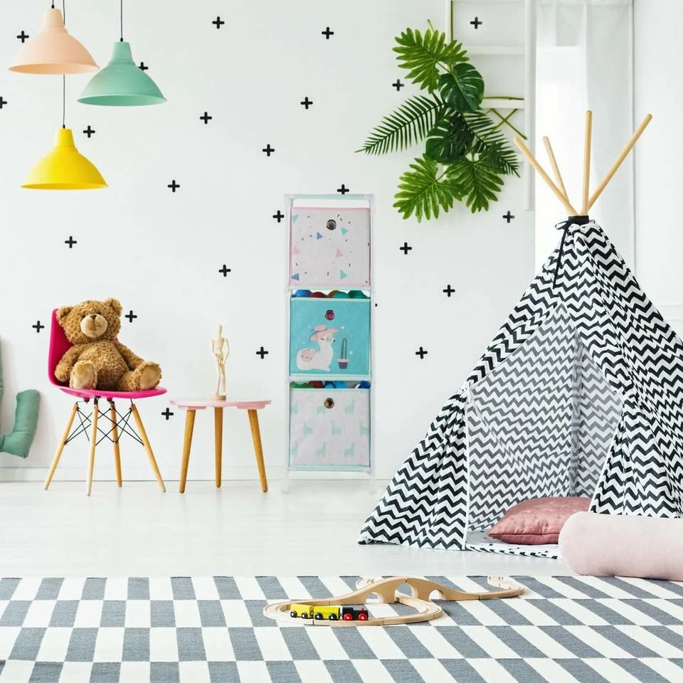 Kindgerechte Aufbewahrung von Spielzeug Mit dem leichten Standregal macht den Kindern nicht nur das Spielen Spaß, sondern auch das Aufräumen. In die bunten Aufbewahrungsboxen des stabilen Kinderzimmerregals sind blitzschnell alle Spielsachen, Kuscheltiere und Bücher verstaut. Das Regal für das Kinderzimmer besitzt zudem die ideale Höhe, damit auch die Kleinen mühelos an die Sachen herankommen. Die Boxen haben ein Griffloch und sind mit einem bezaubernden Motiv versehen: Lustige, bunte Lamas erfreuen nicht nur Kinderherzen.