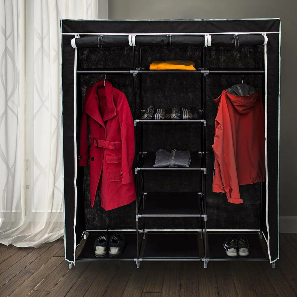 Stabiler Stoffkleiderschrank mit Kleiderstangen Egal, ob Sie Saisontextilien staubfrei lagern oder Ihre Campingausrüstung sicher verwahren wollen – der mobile Stoffschrank in XXL erfüllt alle Wünsche. Mit 9 Ablagen & 2 Kleiderstangen bietet der Faltschrank viel Stauraum für Kleidung, Schuhe & mehr. Der leichte Kleiderschrank aus Stoff ist schnell auf- & abgebaut & eignet sich wunderbar als Reiseschrank beim Camping. Nutzen Sie die Faltgarderobe als Kellerschrank, bleiben Ihre Sachen dank der Reißverschlüsse staubfrei & doch immer zugänglich.