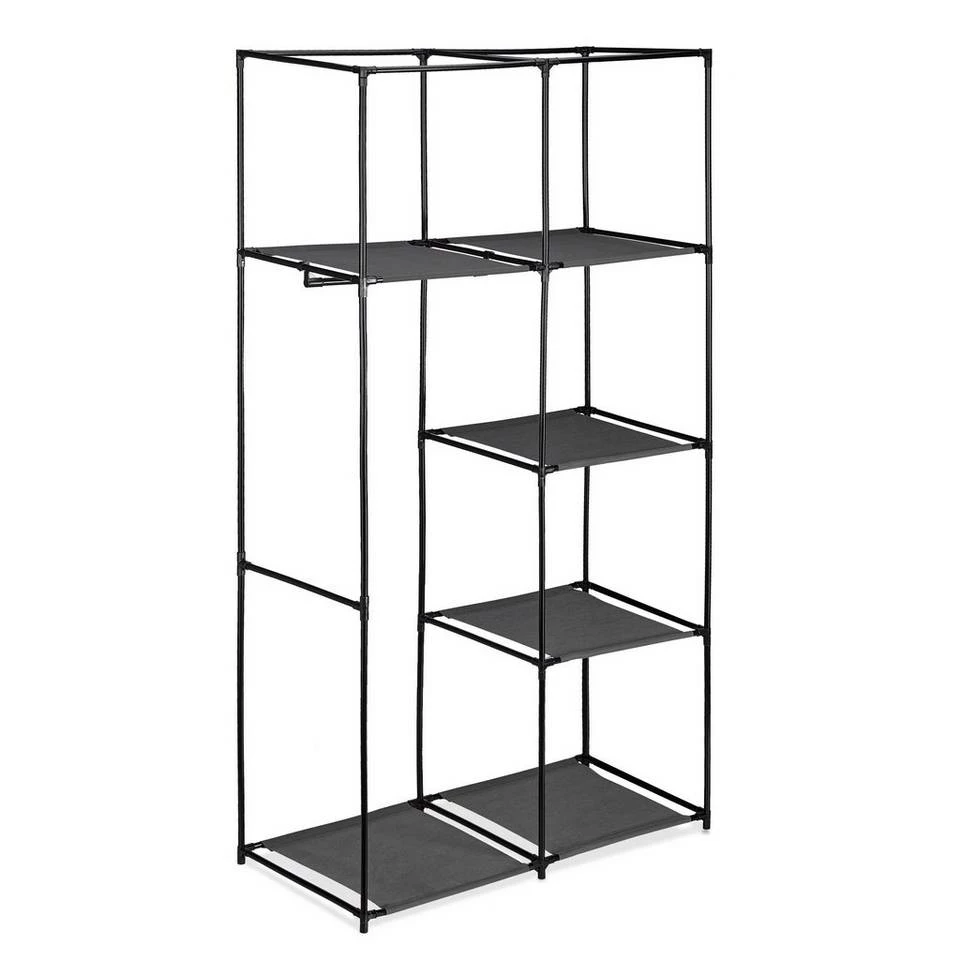 Textil Kleiderschrank mit Kleiderstange & Fächern Dieser Faltkleiderschrank ist ideal zur ordentlichen & übersichtlichen Kleideraufbewahrung. Ob als Kleiderschrank Alternative beim Umzug, Reiseschrank beim Camping oder als Kellerschrank für nicht saisonale Kleider – der Textilschrank ist vielseitig verwendbar. Während Hemden, Jacken oder Blusen an der Kleiderstange Platz finden, können Hosen, T-Shirts oder Schuhe auf den 6 Ablagen verstaut werden. Dank seines unkomplizierten Stecksystems ist der Stoffschrank im Handumdrehen aufgebaut.