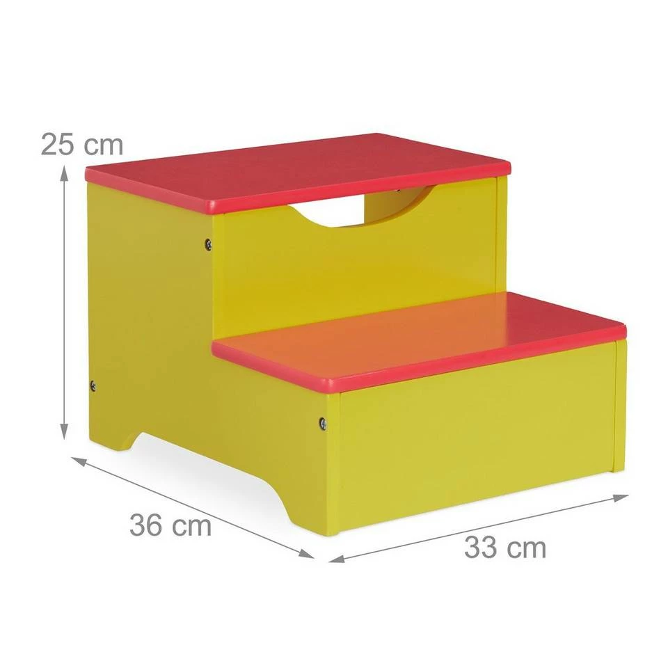 Bunter Kinderschemel als Aufstiegshilfe Dieser niedrige Tritthocker mit 2 Stufen ist die ideale Aufstiegshilfe für Kinder. Der leichte Stufenhocker kann einfach vor einem Regal im Kinderzimmer platziert und jederzeit problemlos umgestellt werden. Somit gelangen Deine Kleinen ohne fremde Hilfe an ihre Spielsachen oder Bücher. Auch im Badezimmer hilft der Kindertritt, das Waschbecken und die Toilette leichter zu erreichen. Die Trittstufe fördert so die Selbstständigkeit Deines Kindes und überzeugt zudem als dekoratives Kindermöbel.