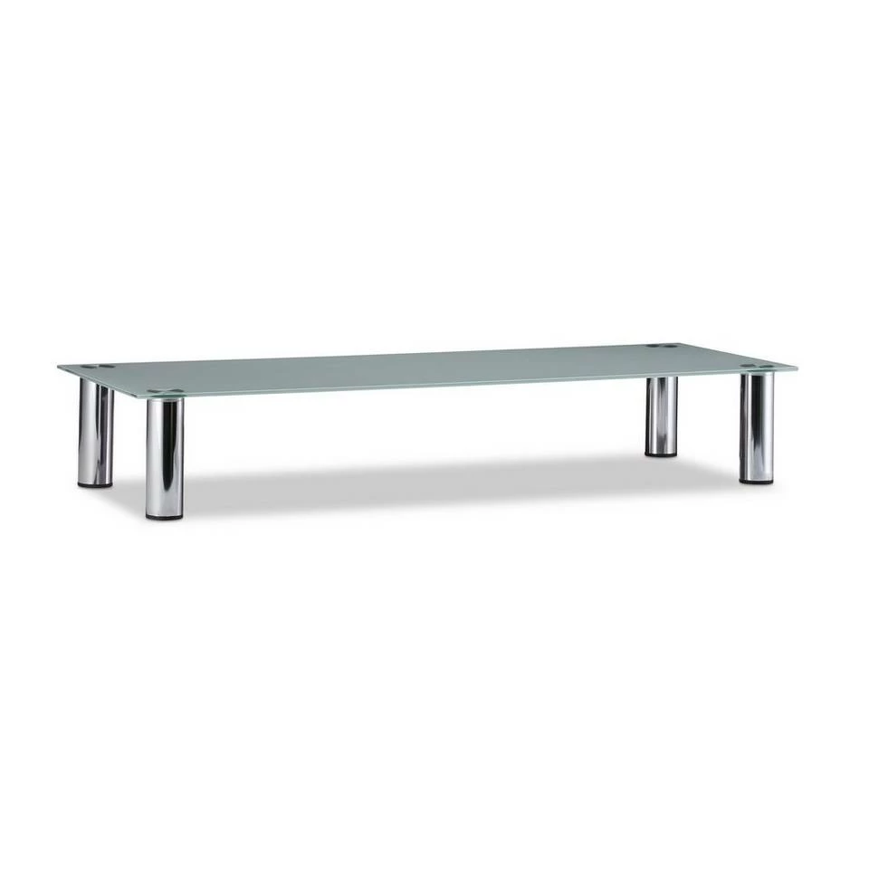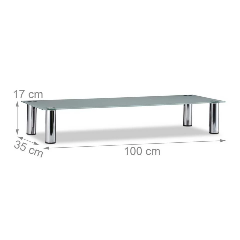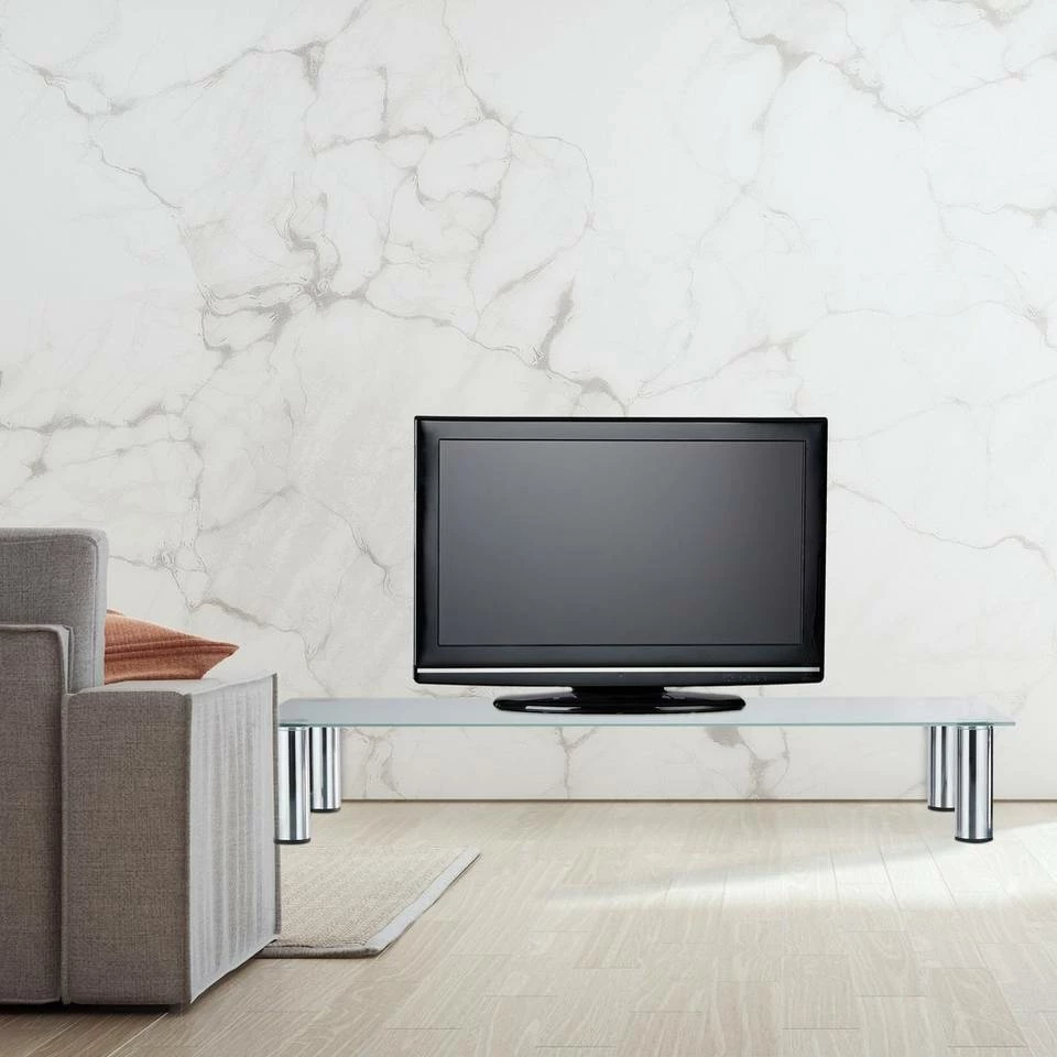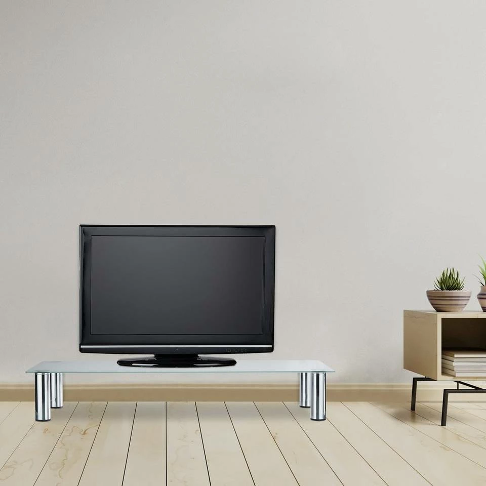Schicker Fernsehtisch und Bildschirmerhöhung in einem Dank der Erhöhung genießen Sie überall beste Sicht. Im Wohnzimmer sorgt der TV-Tisch für die optimale Höhe Ihres Fernsehers. Recorder, Konsolen und andere Geräte finden unter der weißen Glasplatte Platz. Auch als Monitorerhöhung auf dem Schreibtisch oder dekorativer Aufsatz fürs Regal kann der Fernsehtisch punkten. Das funktionale Design des Glastischs verleiht jeder Einrichtung neue Akzente. Die verchromten Metallbeine sind nicht nur schick, sondern hinterlassen dank der Schoner keine Kratzer.