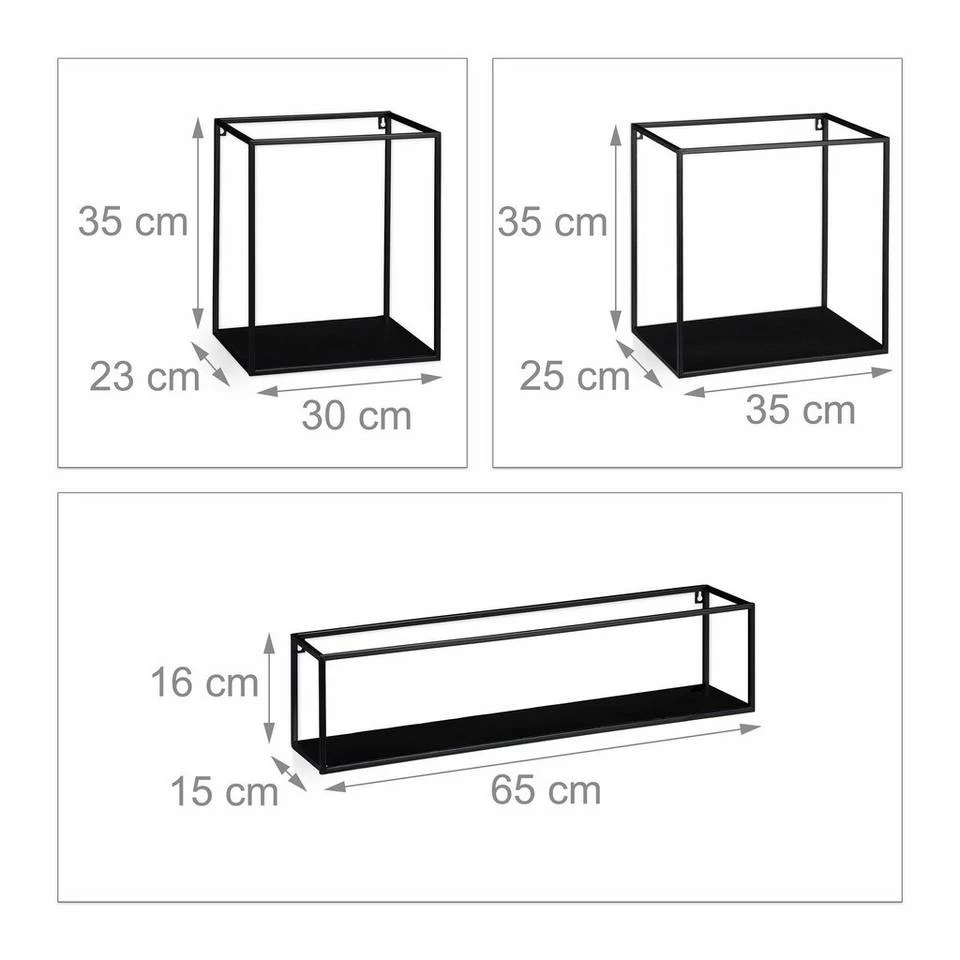 Schwarze Hängeregale Um leeren Wänden neues Leben einzuhauchen, sind die Metallregale im 3er Set eine gute Wahl. Dabei ist es Ihnen überlassen, ob Sie die Hängeregale zusammenspielen lassen oder lieber einzeln platzieren. Was immer Sie mit den Cube Regalen in Szene setzen möchten, dank des dezenten Schwarz kommen Ihre Accessoires erstklassig zur Geltung. Das gilt für Vasen, Fotos, Figürchen und vieles mehr. Dübel und Schrauben für die Wandmontage liegen bereits bei.
