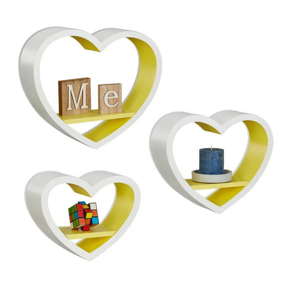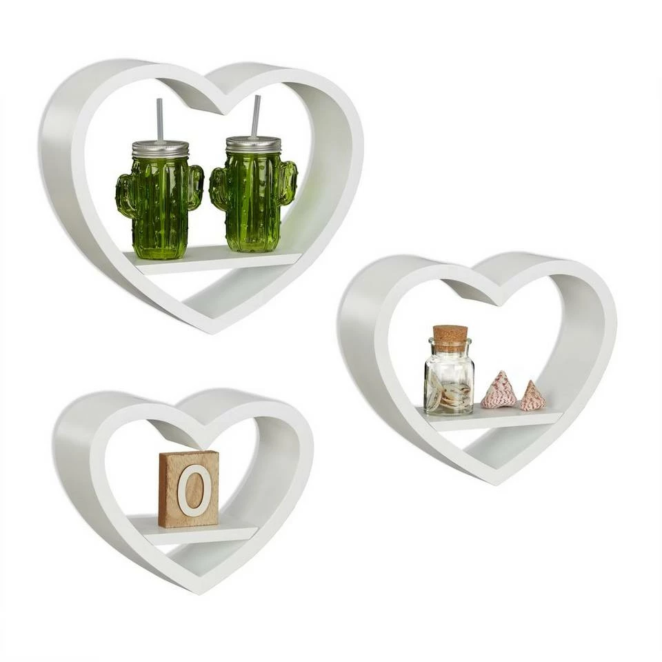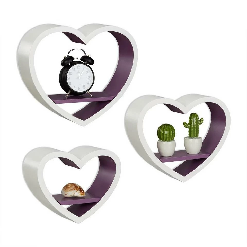 Wandregal Herzen für Ihr Zuhause Das romantische Wandregal Herz im praktischen 3er Set schmückt jede Wand. Urlaubsfotos, Souvenirs und Dekoaccessoires kommen auf dem herzförmigen Schweberegal erst richtig zur Geltung. Das Set aus drei Wandablagen in verschiedenen Größen besteht aus robustem MDF mit einer matten Lackierung. Sie haben die Auswahl zwischen vielen verschiedenen Farben, ob Rot wie die Liebe oder Grün wie die Hoffnung. Das Dekoregal ist ein schönes Geschenk insbesondere für junge Frauen. Aber nicht nur im Mädchenzimmer sind die Herzen ein Hingucker. Schmücken Sie mit den dekorativen Wandboards Wohnzimmer, Schlafzimmer oder den Flur.