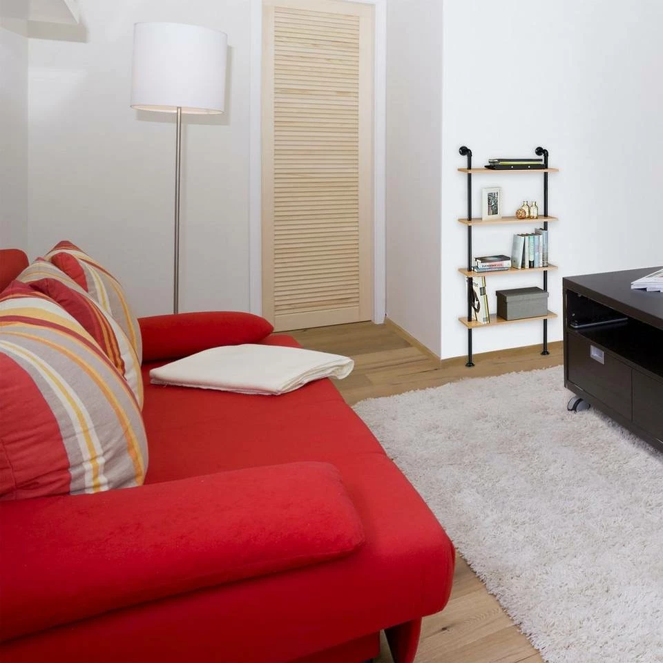 Wandregal im Industrie-Design Das große Wandregal im Retro-Design schafft für Sie cleveren Stauraum für Küche, Wohnzimmer oder Schlafzimmer. Dazu passt das Regal auch perfekt als Deko-Accessoire in Lofts, Bars oder einem trendigen Café. Der rustikale Materialmix aus Holz sowie Eisenrohr fällt Ihren Besuchern sofort ins Auge und passt sich ideal in viele Wohnräume ein. Das Montagematerial garantiert, dass das stylische Wandboard im Vintage-Stil mit nur wenigen Handgriffen angebracht ist. Holen Sie sich dieses Retro-Objekt nach Hause!