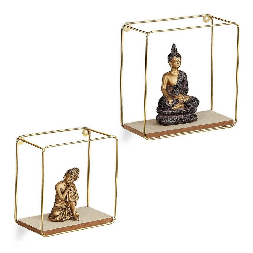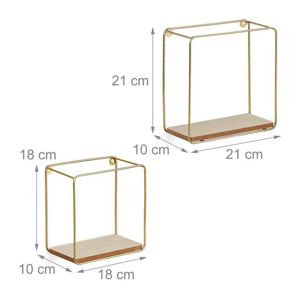 Quadratische Metallregale für die Wand Kleine Dekofiguren, Bilder oder Pflänzchen können Sie mit diesen geometrischen Schweberegalen wirkungsvoll präsentieren. Die goldenen Quadratregale begeistern mit ihrem filigranen Metallgestell und dem minimalistischen Design, das den Fokus gekonnt auf den Inhalt lenkt. Die kleinen Dekoregale im 2er Set passen in Wohnzimmer, Schlafzimmer, Flur oder Küche. Einzeln aufgehängt sind die Metall-Wandregale ebenso dekorativ, wie wenn Sie die 2 unterschiedlichen Größen gemeinsam arrangieren.