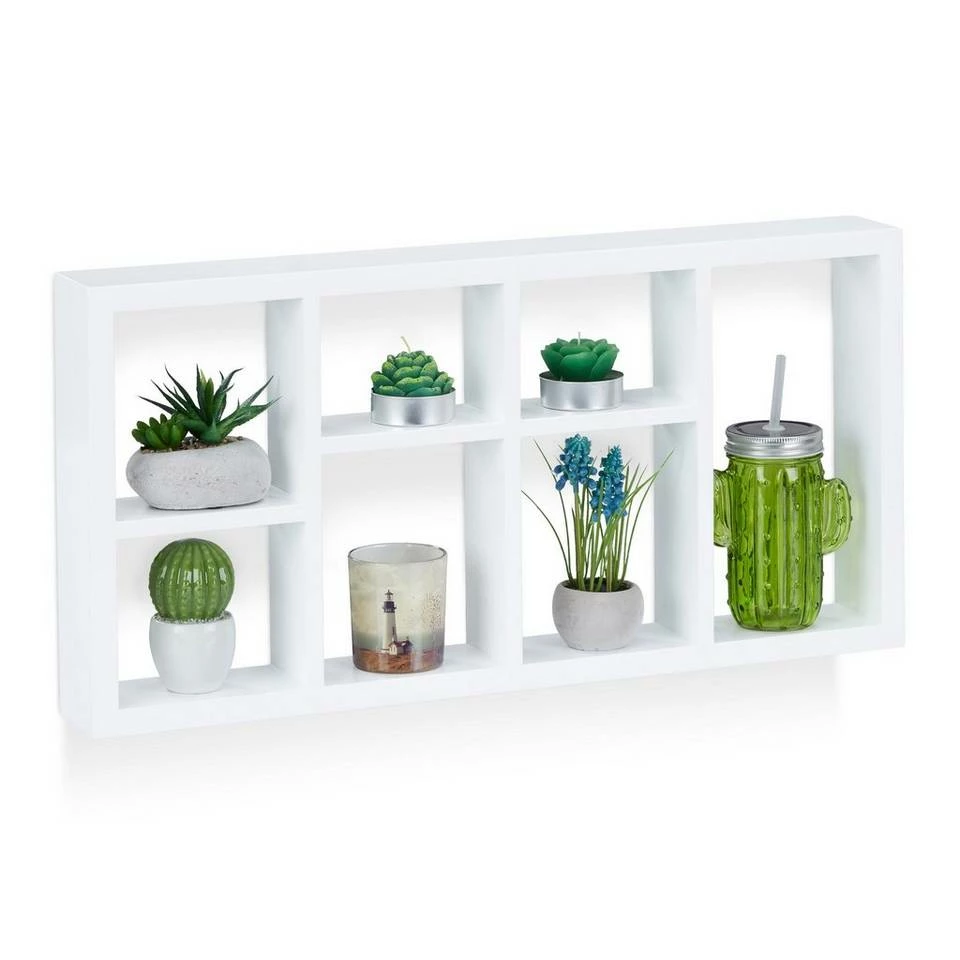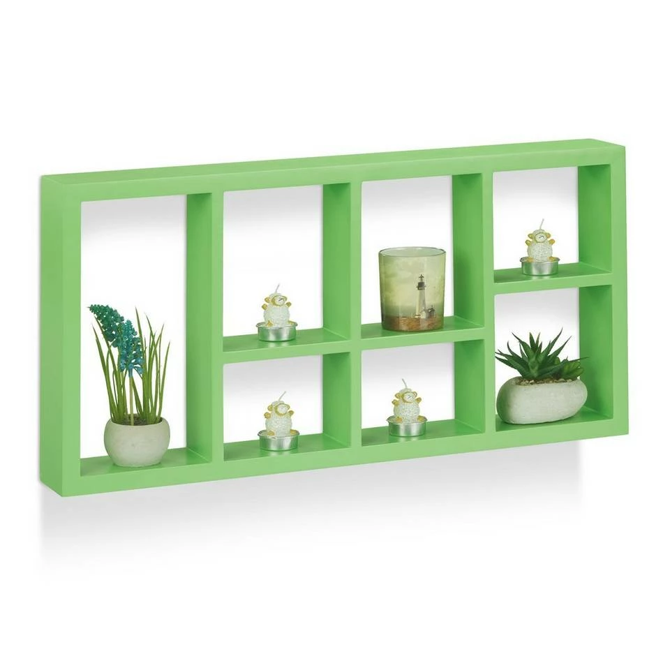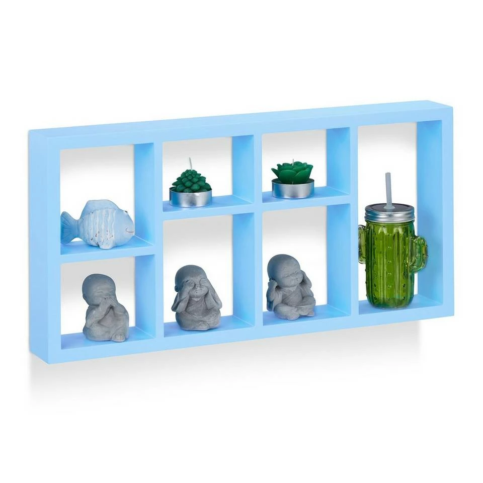Schweberegal im Hoch- oder Querformat aufhängen Das Schweberegal bietet mit seinen 7 Fächern in 5 unterschiedlichen Größen zusätzlichen Stauraum für Figuren, Vasen, CDs und vieles mehr. Das Hängeregal bewahrt Dinge nicht nur einfach auf, sondern präsentiert sie auf eine sehr angenehme Weise. Dafür sorgen schon die freundlichen Farben der verschiedenen Varianten, die das schwebende Regal auch zu einem Hingucker im Kinderzimmer machen. Dank der 8 gebohrten Aufhängungen auf der Rückseite können Sie das Wandboard im Hoch- oder Querformat aufhängen.
